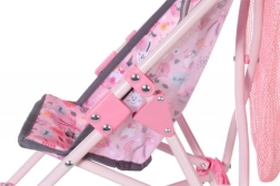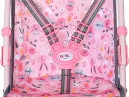Sēdeklis ar jautru apdruku un drošības jostām notur lelli stingri un ērti savā vietā visa brauciena laikā.