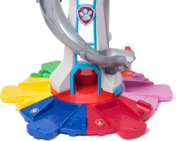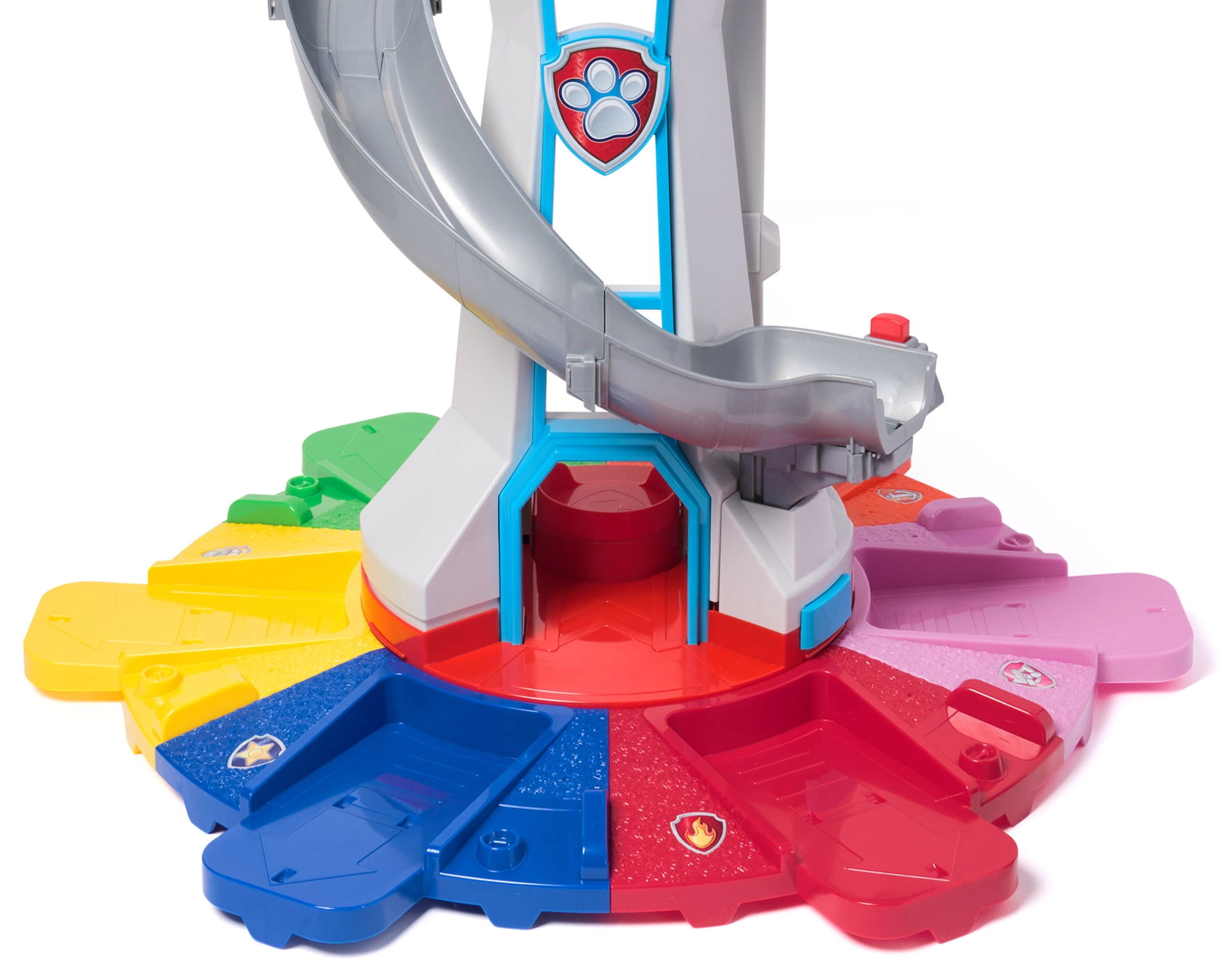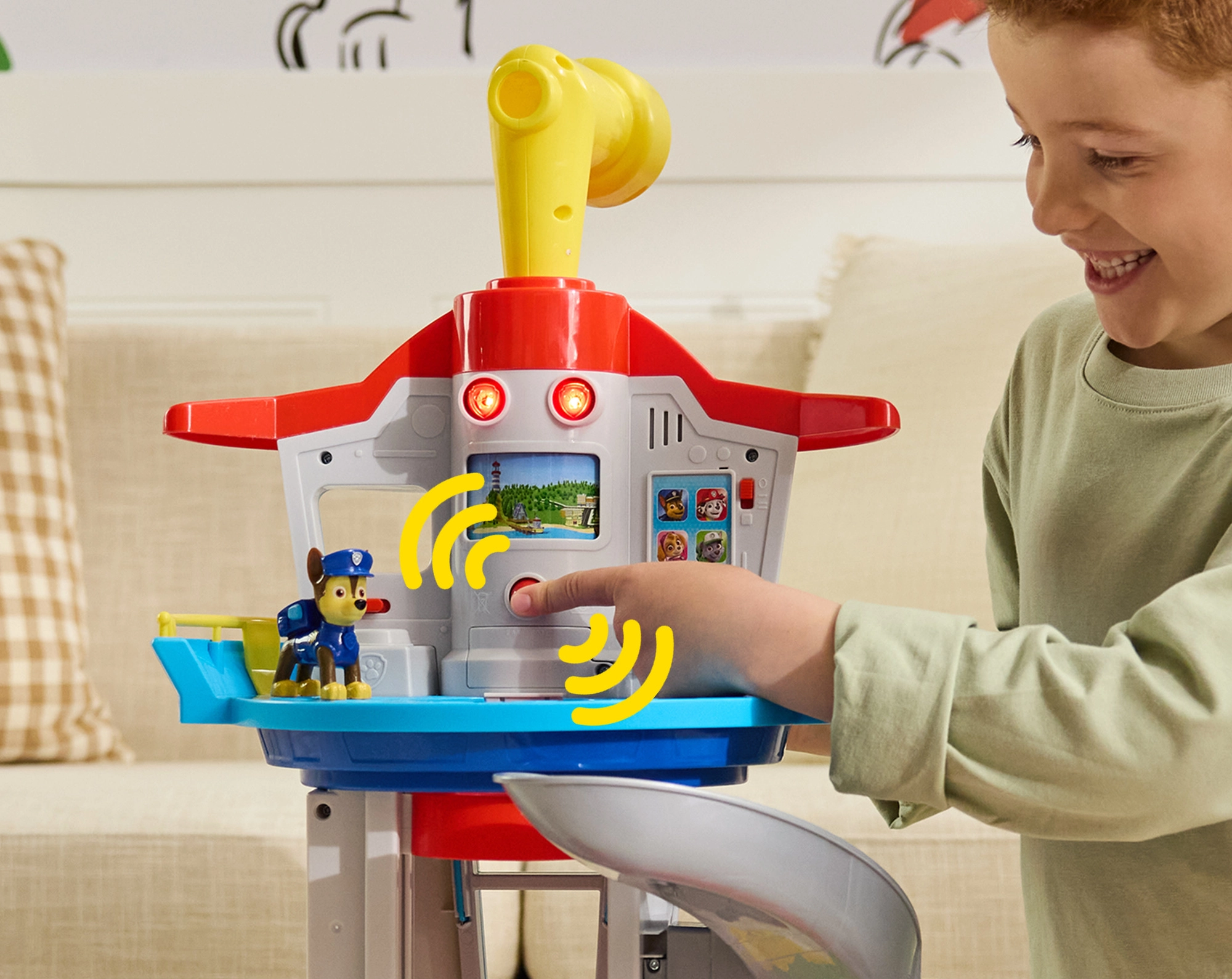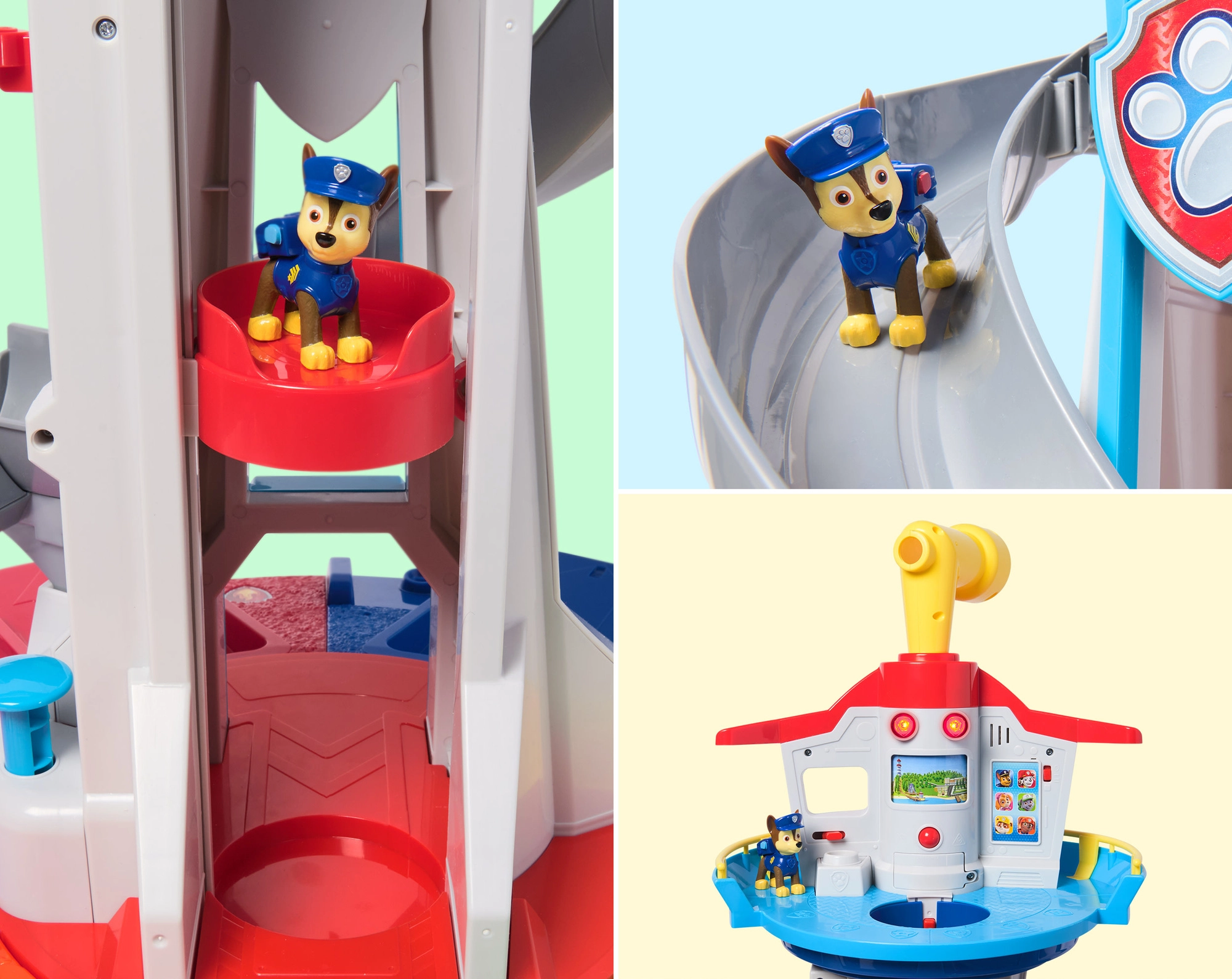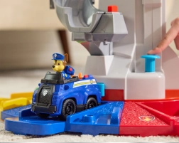 PAW PATROL ikoniskā bāze sniedz bērniem bezgalīgas spēļu iespējas. Izvēlieties misiju no paneļa ar pogām un efektiem, uzvediet Čeisu augšā ar liftu, aplūkojiet apkārtni ar rotējošo periskopu un sāciet varonīgo glābšanas akciju pa plato slidkalniņu tieši uz rotējošo palaišanas rampu.
