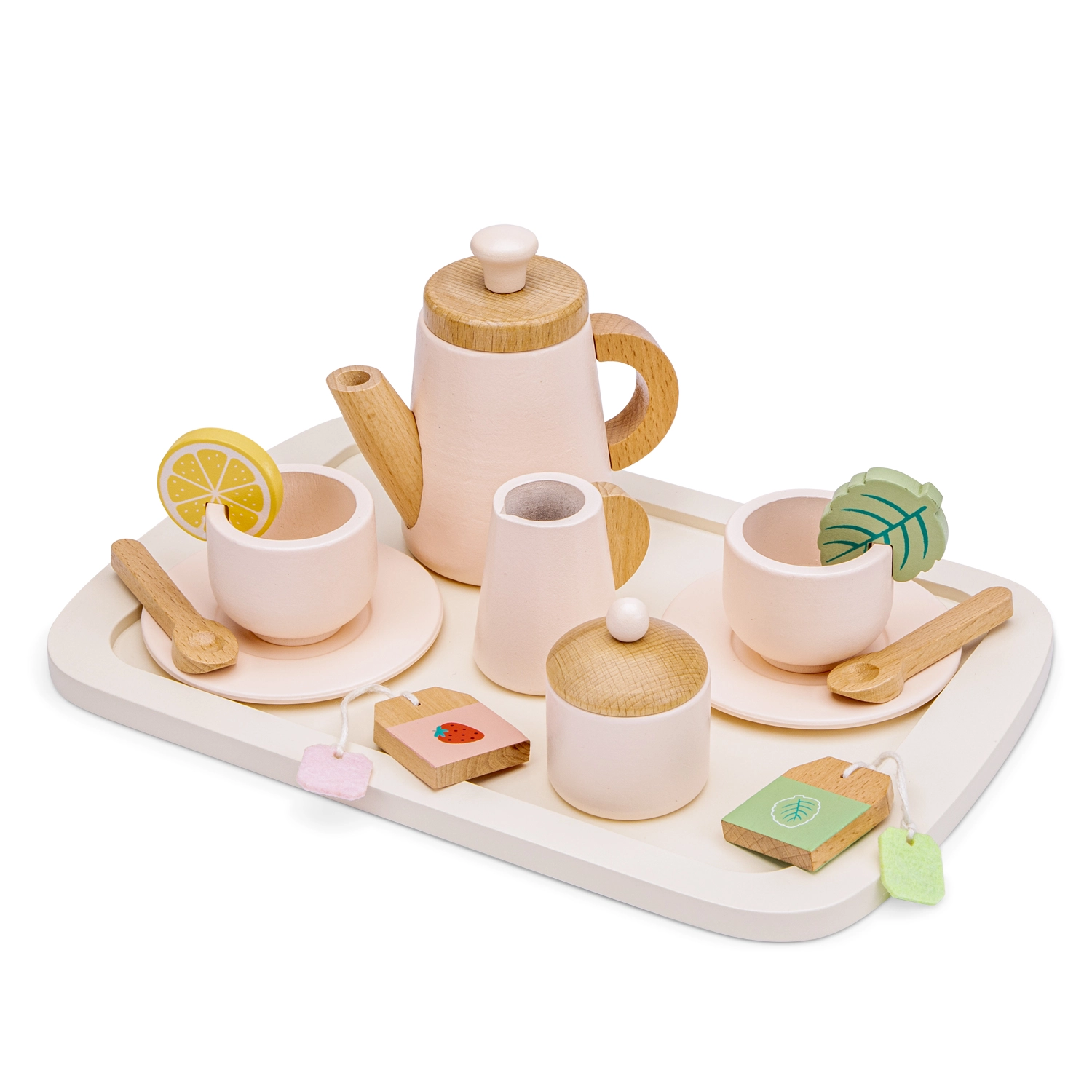 Uzaiciniet mīkstās rotaļlietas un draugus uz stilīgu tējas ballīti ar skaistu koka komplektu bērniem no 2 gadu vecuma. Komplektā ietilpst tējkanna ar vāciņu, 2 tasītes ar apakštasītēm, piena kanniņa, cukurtrauks, karotītes, tējas maisiņi, citrona šķēlīte, piparmētras lapiņa un ietilpīga paplāte. Veicina sīko motoriku, iztēli un socializējošās spēles, un, pateicoties dabiskajam koksam un maigiem toņiem, lieliski iederas bērnu istabā.
