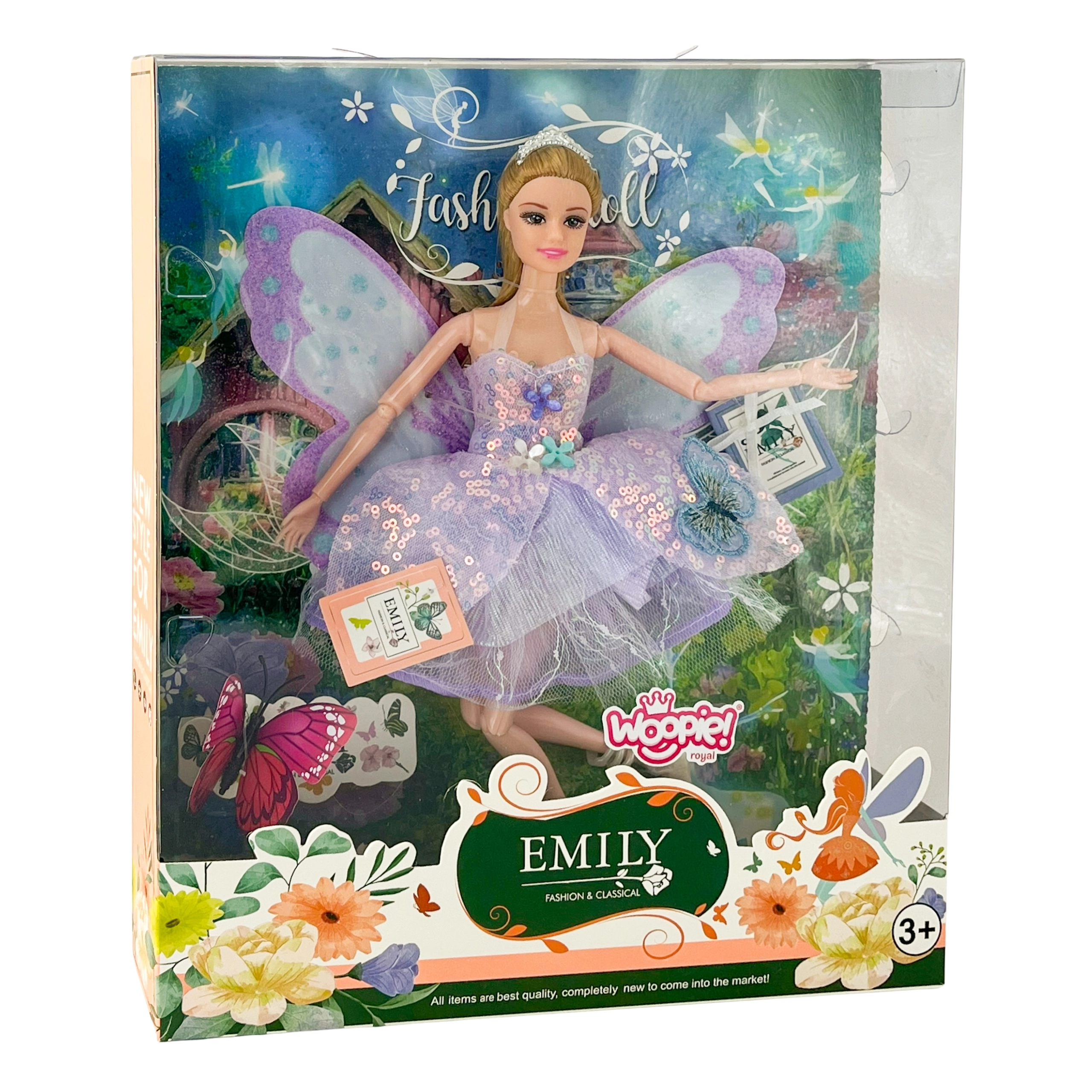 Woopie Royal feja Emi ir radīta mazajām pasaku mīļotājām. Maigie violetie pasteļtoņi, mirdzoši dekori un viegla tila svārku daļa veido apburošu izskatu, kas izcelsies jebkurā bērnistabā. Pateicoties kustīgām ekstremitātēm un noņemamiem tauriņu spārniem, bērni var veidot savas burvju ainas un stāstus.