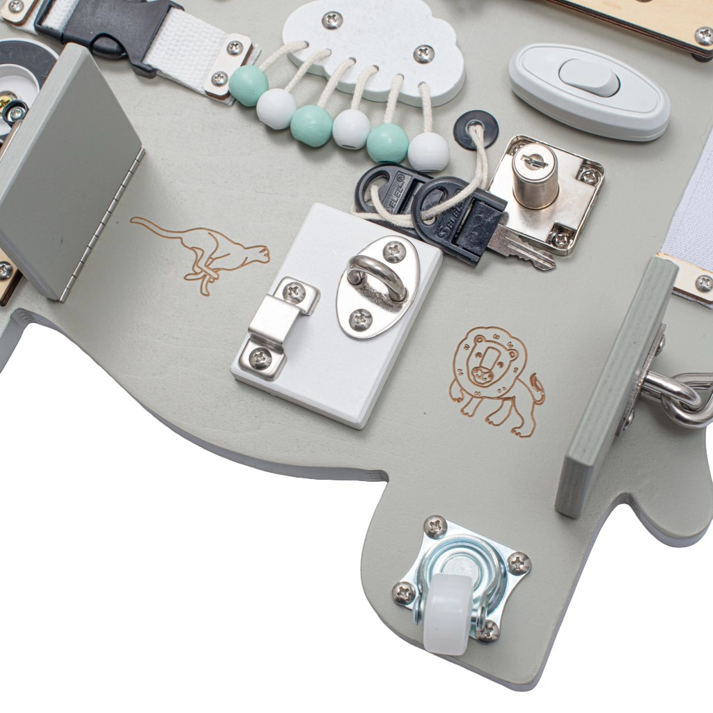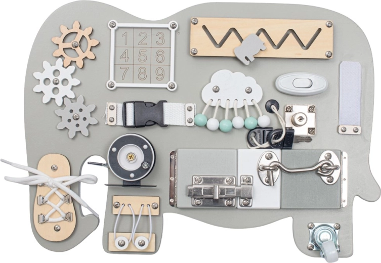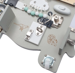 Šī izglītojošā Montessori aktivitāšu dēlis bērniem piedāvā reālus ikdienas dzīves stimulus un motivē patstāvīgi izzināt pasauli. Elegantais ziloņa dizains lieliski iekļaujas jebkurā interjerā, un pateicoties izturīgam kokam, tas kalpo arī intensīvas lietošanas laikā.