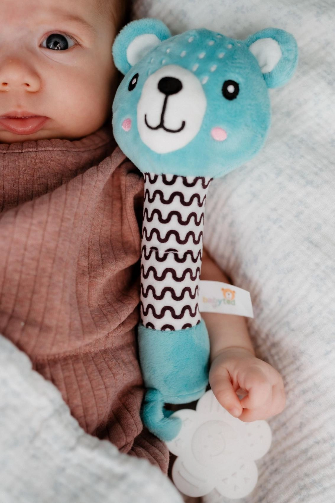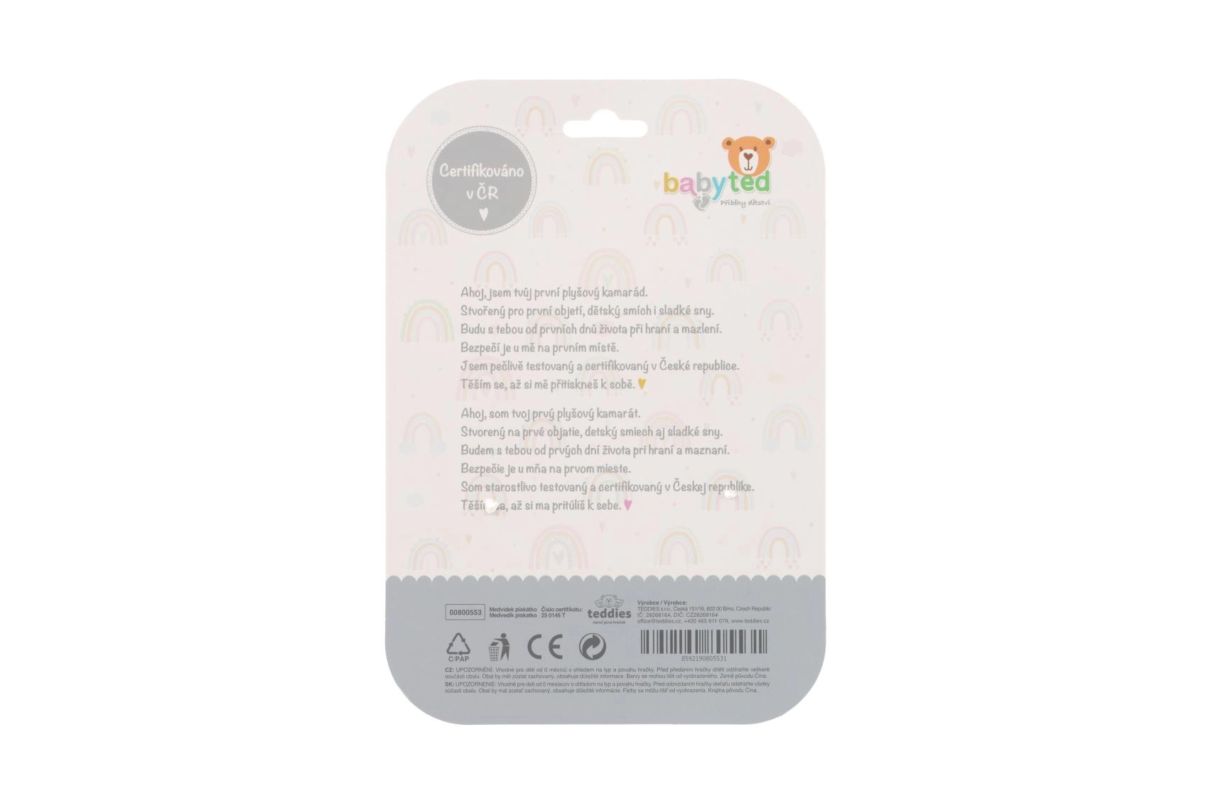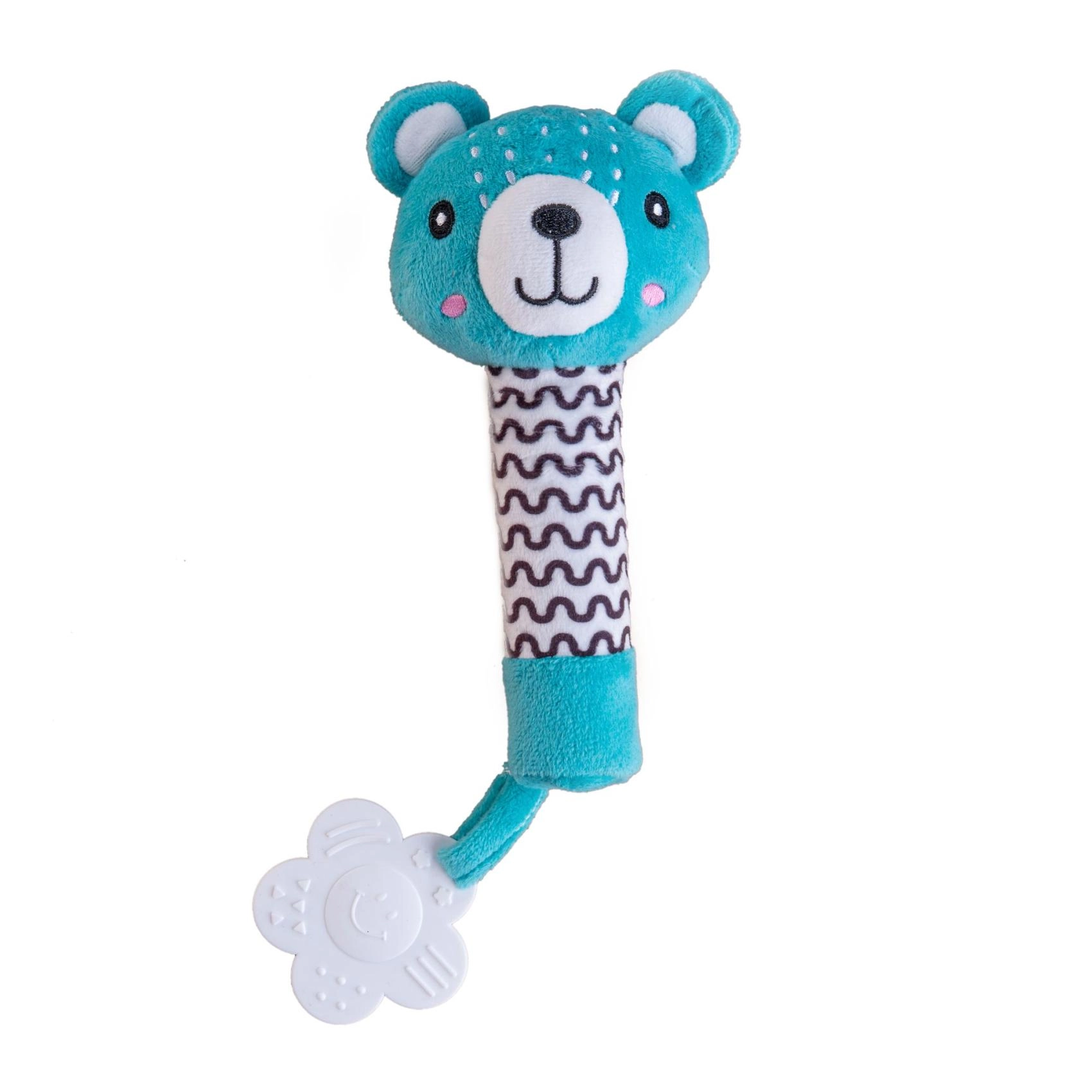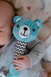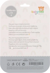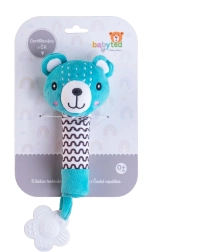 Mīlīgais pūkainais grabulītis ar lācīti no BABYTED ir ideāla pirmā rotaļlieta zīdaiņiem no 0 m+. Pateicoties garam, mīkstam rokturim, to ērti satvert mazajās rociņās; nospiežot tas maigi čīkst un attīsta dzirdes uztveri. Beigās ir mīksta košļājamā rotaļlieta ziediņa formā, kas sniedz atvieglojumu jutīgām smaganām. Maigs, drošs plīša materiāls un kontrastaini raksti veicina redzi un sensoru attīstību. Rotaļlieta ir sertificēta Čehijā un atbilst stingriem drošības standartiem.