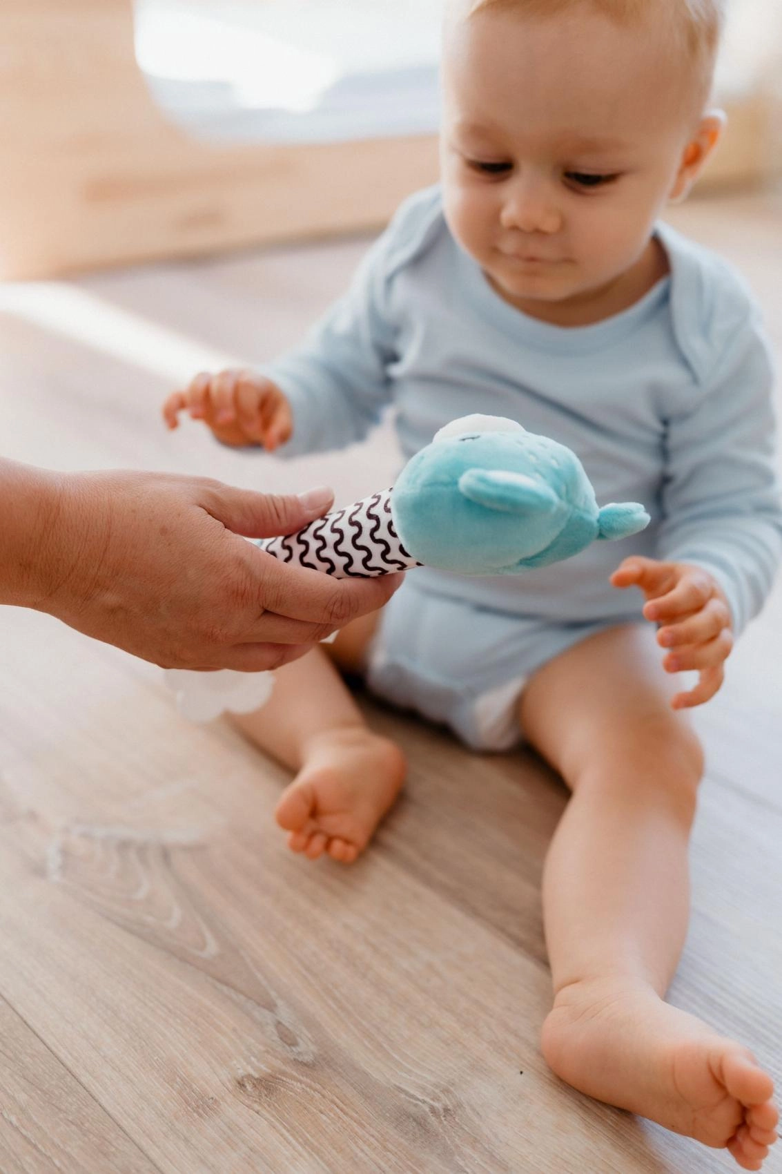 Nospiežot rotaļlietu, tā izdod nomierinošu čīkstošu skaņu, kas dabiski piesaista mazuļa uzmanību un veicina dzirdes uztveres attīstību.