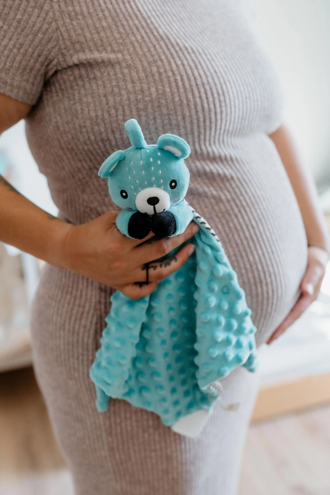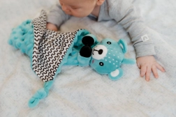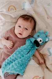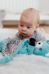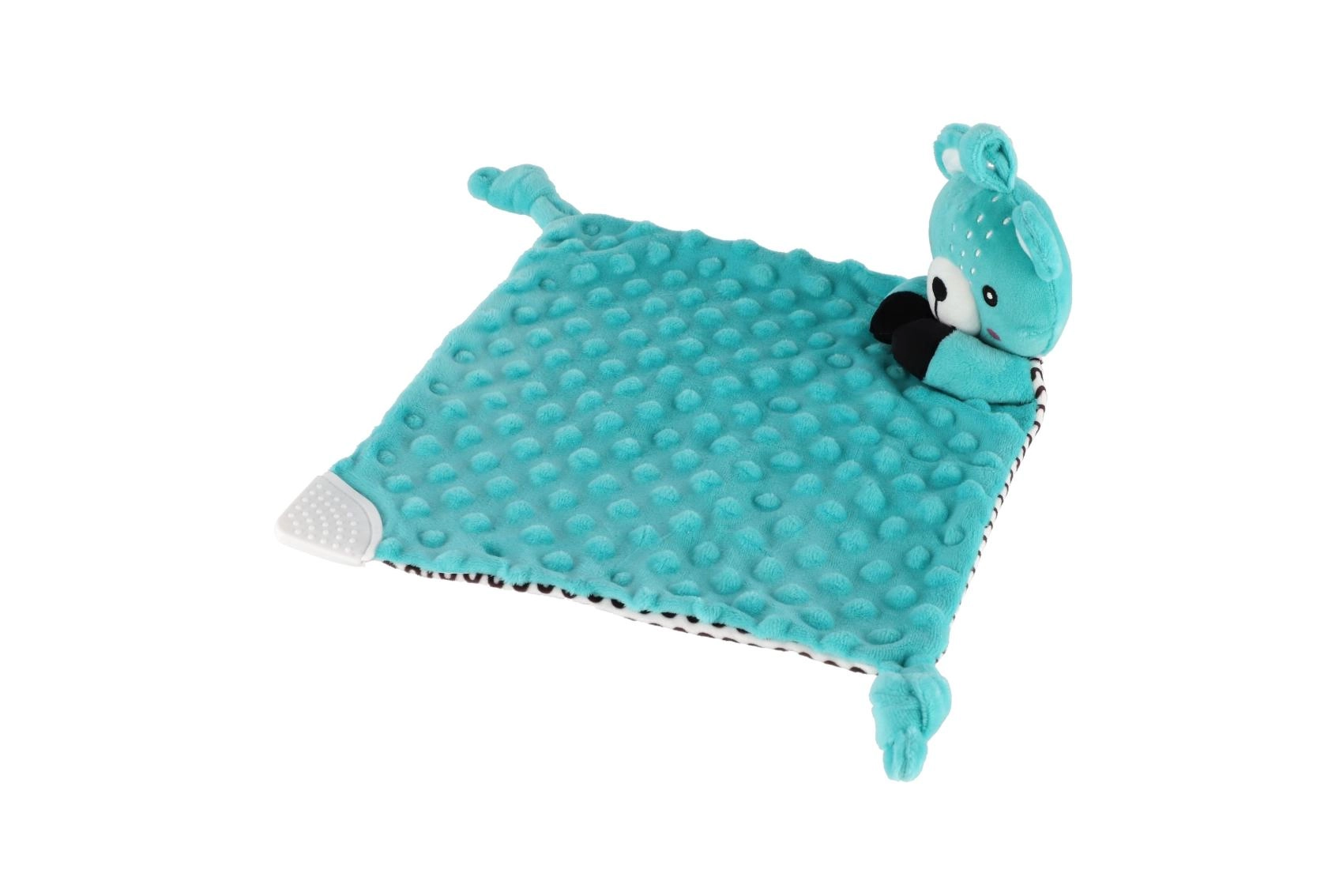 Mīkstā košļājamā rotaļlieta segas stūrī palīdz mazināt jutīgu smaganu diskomfortu zobiņu šķilšanās laikā, droša bērniem no dzimšanas.