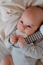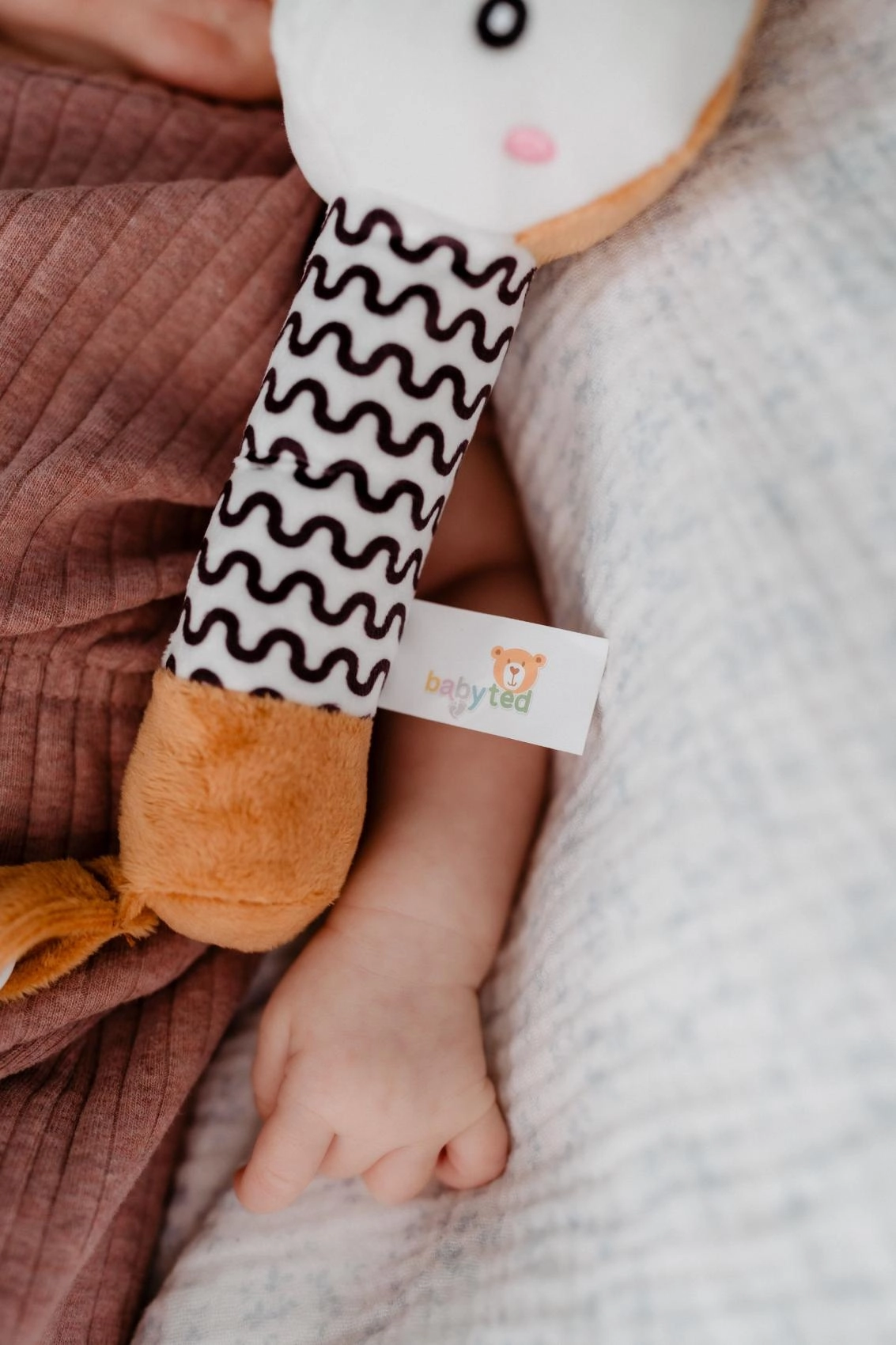 Garais un mīkstais ķermenītis labi ieguļ mazajās rociņās, bet melnbaltais raksts veicina zīdaiņu vizuālo uztveri.