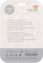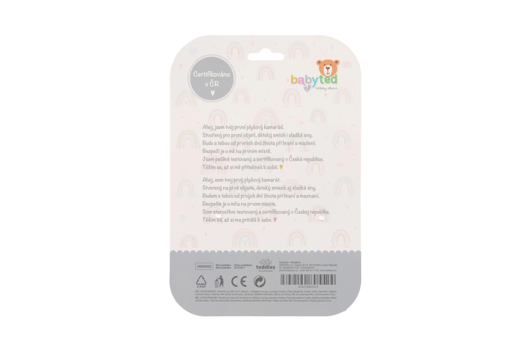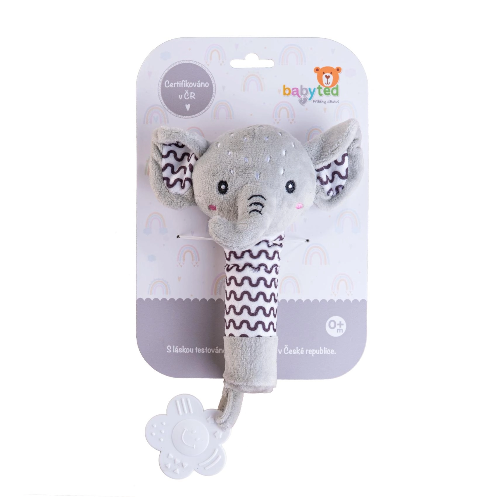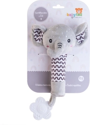 Mīlīgs mīksta plīša pīkstulis ar graužamo elementu ziloņa formā no zīmola BABYTED iepriecinās mazuļus jau no dzimšanas. Tam ir mīksts korpuss ērtai satveršanai, saspiežot maigi pīkst, bet roktura galā ir mīksts graužamais ziediņa formā jutīgu smaganu atvieglošanai. Kontrastaini raksti veicina vizuālo uztveri, bet drošs, maigs plīšs ir saudzīgs pašiem mazākajiem. Sertificēts Čehijā atbilstoši stingriem drošības standartiem.