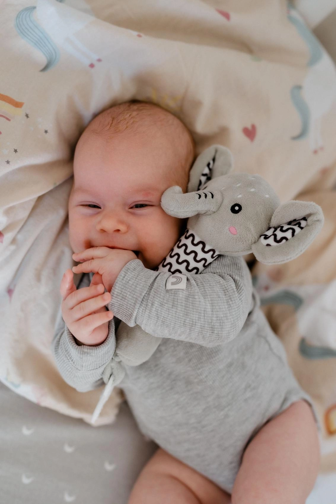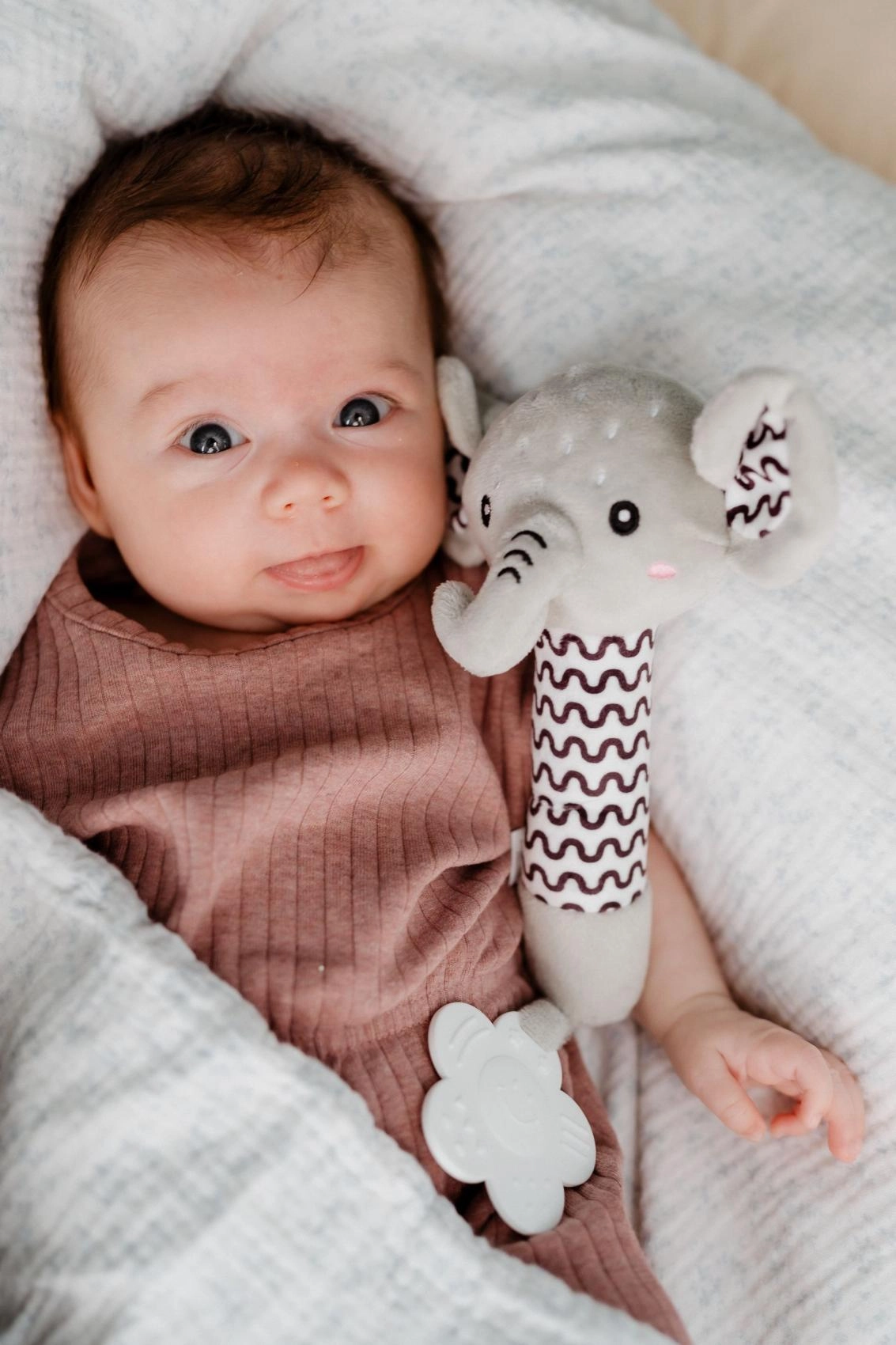 Plīša zilonis ar pīkstuli un graužamo ir ideāla pirmā rotaļlieta jaundzimušajiem. Pateicoties ergonomiskajai, iegarenajai formai, to viegli satvert arī mazajās rociņās, maigs pīkstiens stimulē dzirdi un piesaista mazuļa uzmanību. Maigs, drošs materiāls nodrošina patīkamu pieskārienu un nomierinošas sajūtas mīļošanās laikā.