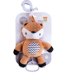 Vienkāršu piestiprināšanu nodrošina izturīgs piekāršanas klipsis, tāpēc stirniņš var pavadīt jūsu mazuli ratiņos, autokrēsliņā, pie gultiņas vai uz rotaļu arkas. Kontrastains raksts uz vēdera un smalkas detaļas veicina redzes uztveres un sīkās motorikas attīstību.