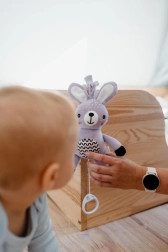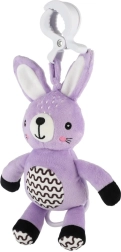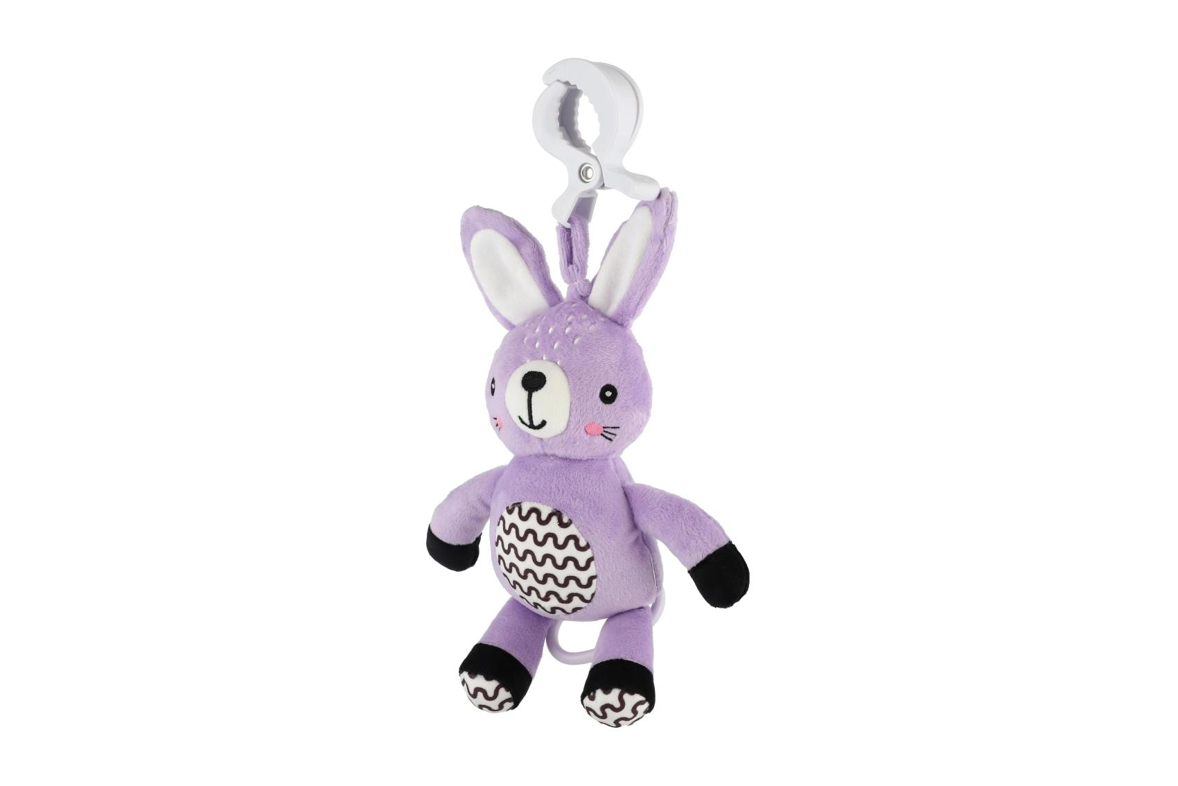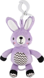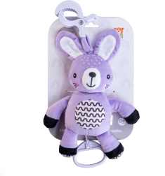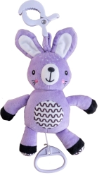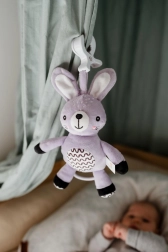 Šis piekaramais plīša zaķītis sniedz mazulim mierinājumu, maigu stimulāciju un drošu izklaidi gan mājās, gan ceļā. Uzvilkamais mehānisms pēc pavilkšanas atskaņo patīkamu melodiju, kas palīdz radīt mierīgu vidi atpūtai. Pateicoties universālajam klipsim, rotaļlietu viegli piestiprināt pie ratiņiem, gultiņas, autokrēsliņa vai aktivitāšu arkas.