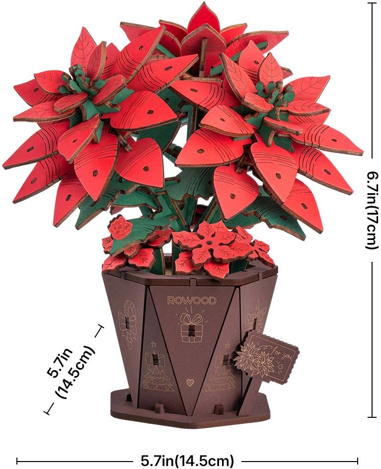 Šī elegantā 3D koka Ziemassvētku zvaigzne podiņā sastāv no ar lāzeri izgrieztām detaļām, kuras ir numurētas ātrai un intuitīvai montāžai. Pateicoties stabilai konstrukcijai, tā lieliski tur formu un pēc salikšanas veido iespaidīgu svētku rotājumu ar reālistiskām lapām un ziedlapām.