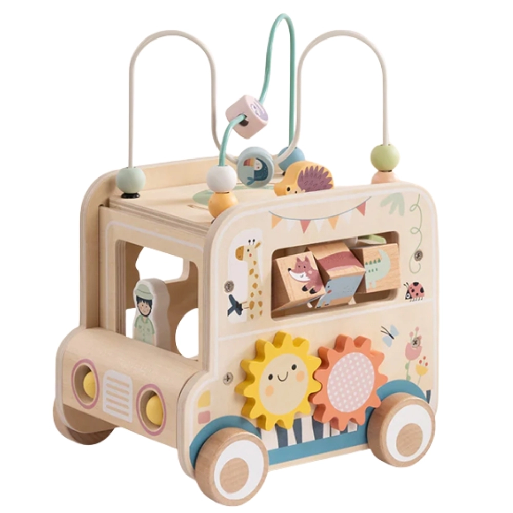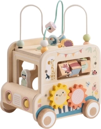 Koka aktivitāšu kubs/safari auto bērniem piedāvā neskaitāmas atklāšanas iespējas. No noņemamās motorikas cilpas ar krellēm līdz labirintam un zobratiem, kā arī griežamiem klucīšiem ar dzīvniekiem – katra puse sniedz jaunu izaicinājumu. Maigo krāsu dizains un gluds apstrādājums veicina drošu spēli un prasmju attīstību.
