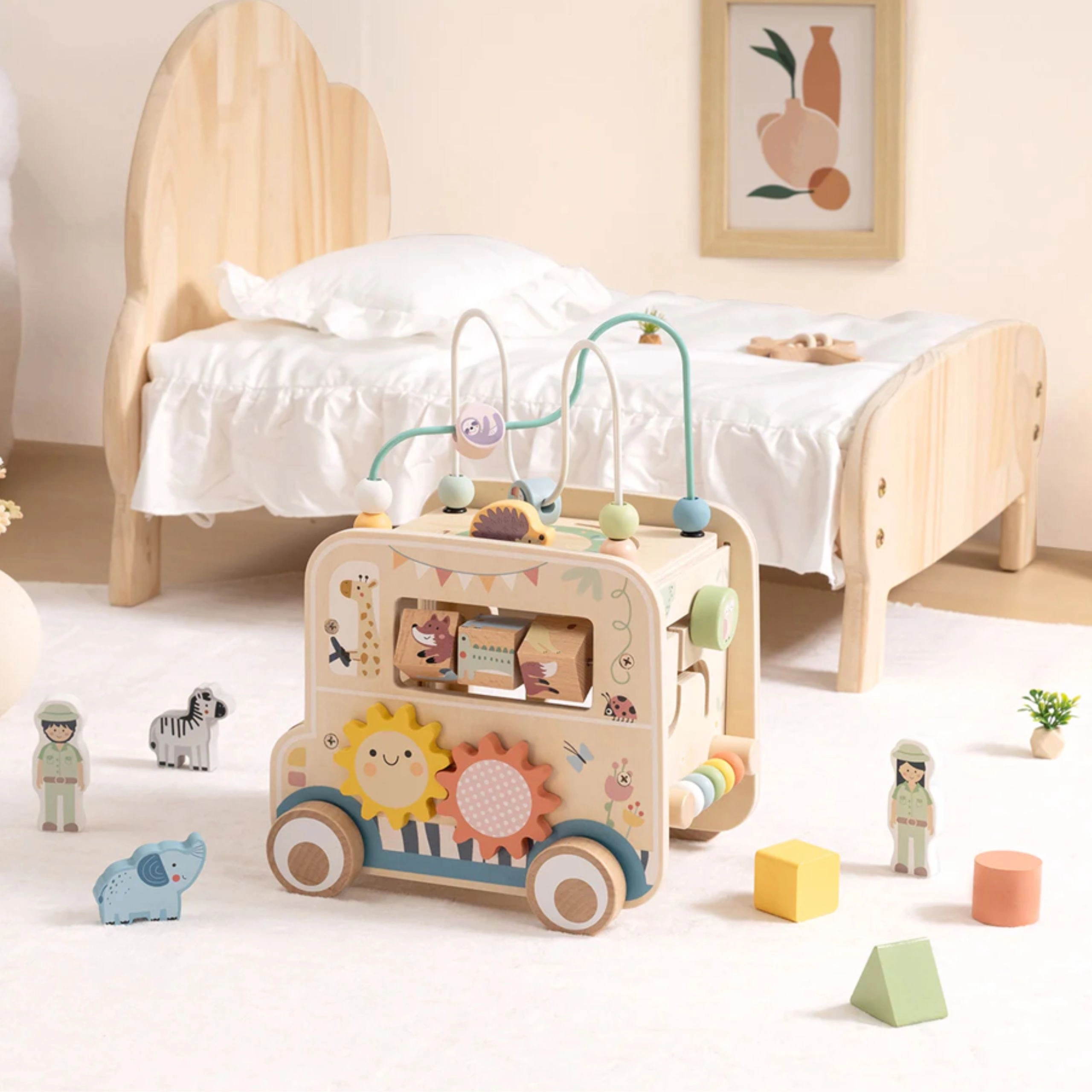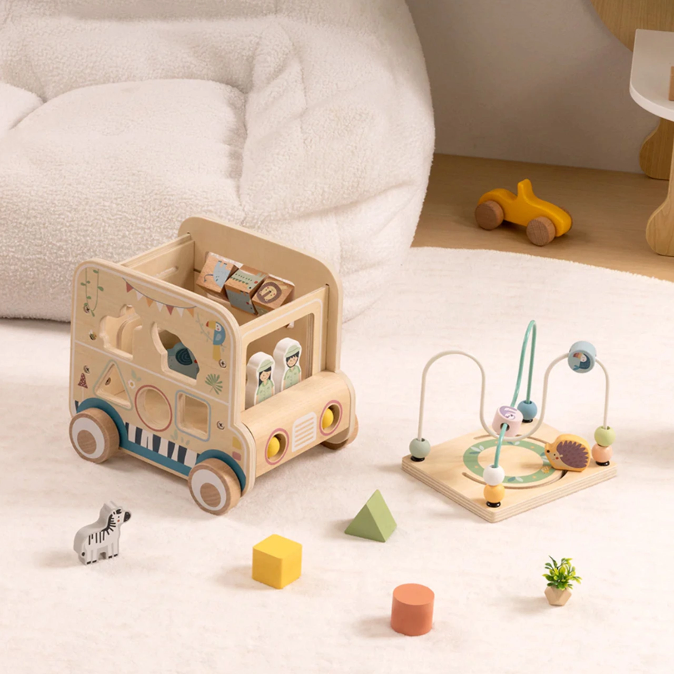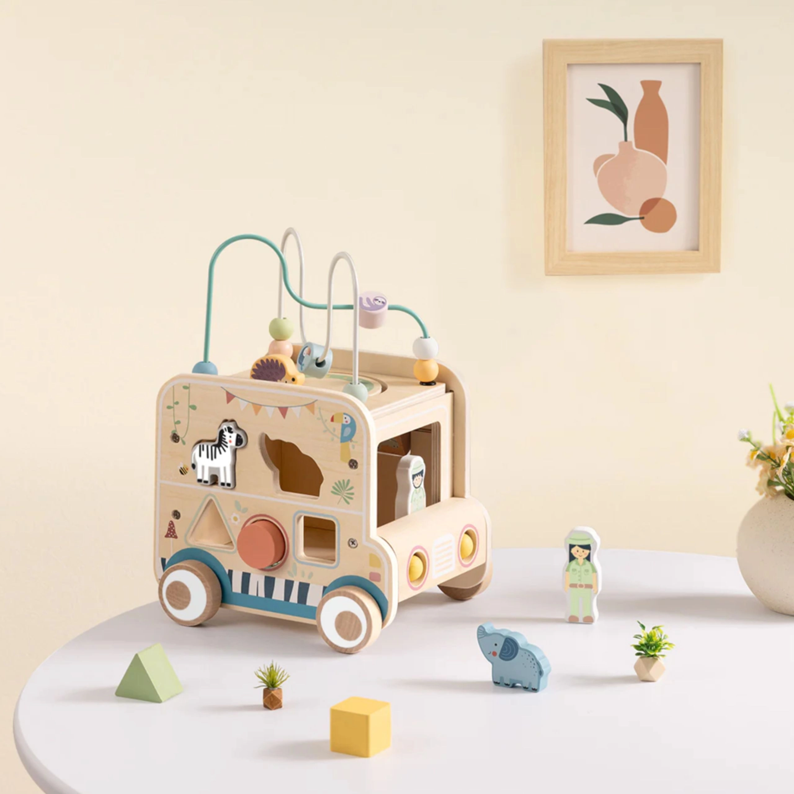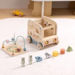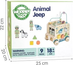 Atklājiet rotaļīgo pasauli ar koka aktivitāšu kubu safari auto formā no zīmola WOOPIE GREEN. Šī daudzfunkcionālā rotaļlieta apvieno motorikas labirintu, formu šķirošanu, griežamus zobratus un attēlu klucīšus, lai veicinātu sīko motoriku, koordināciju un radošu spēli bērniem no 18 mēnešu vecuma.