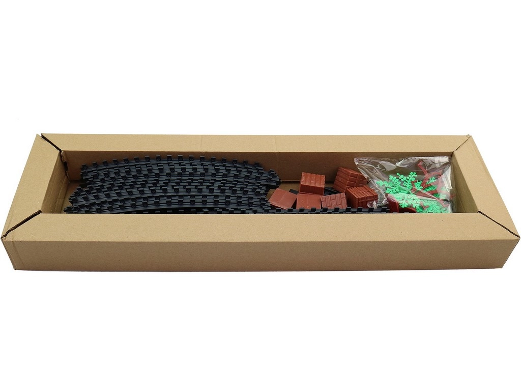Lokomotīve ar tenderi un kravas vagoniem, tostarp liektās sliedes, izveido ovālu līdz pat 151 × 92,5 cm.