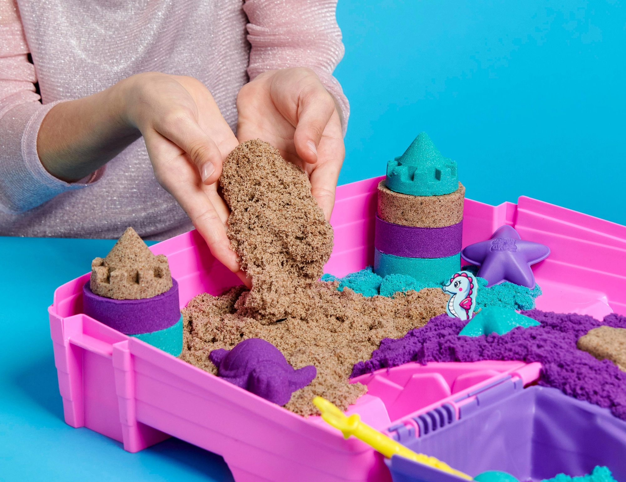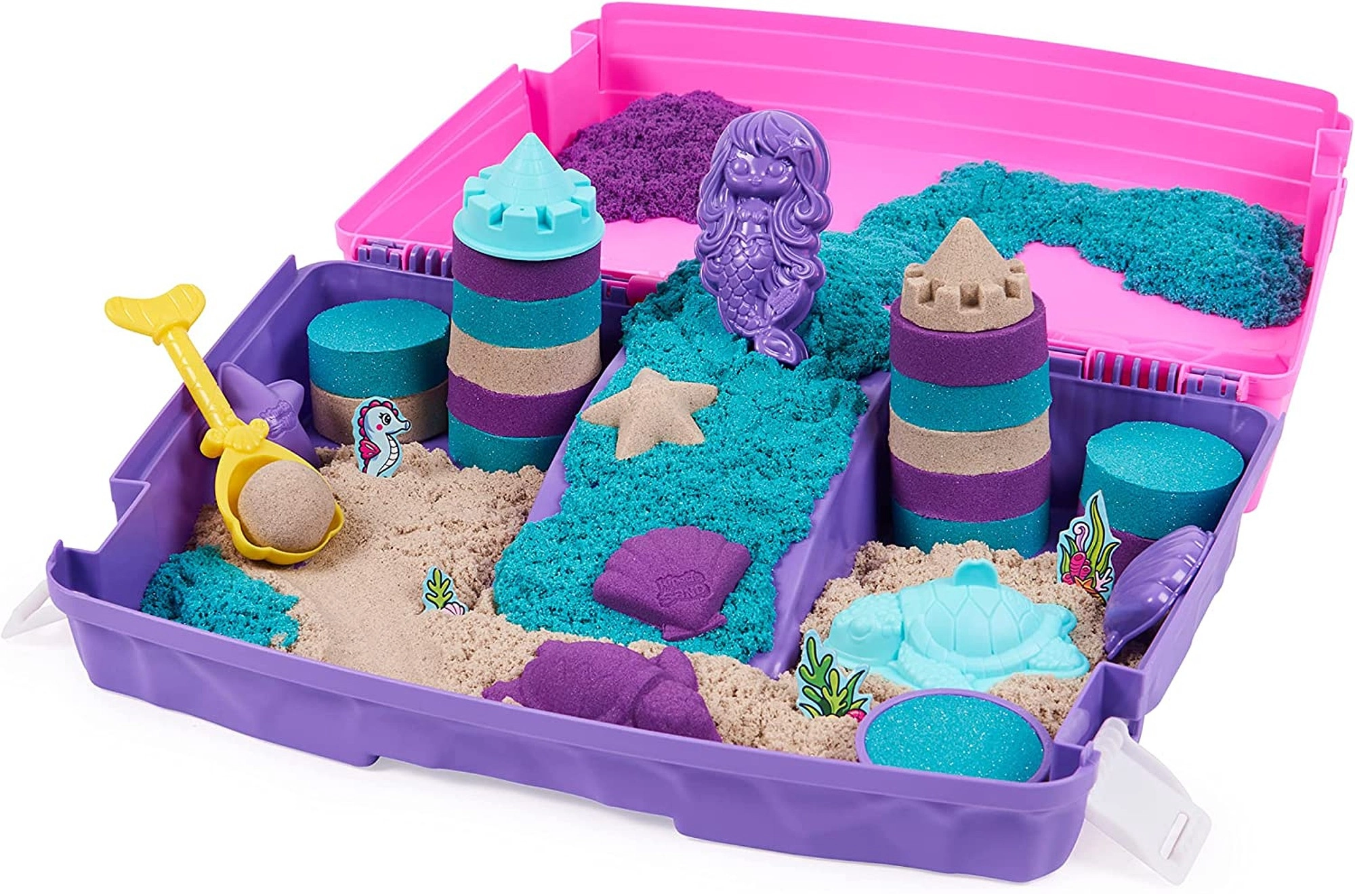 Mermaid Palace komplekts ērtā koferītī piedāvā 934 g smilšu 3 krāsās un formu un rīku kolekciju jūras valstības veidošanai. Smiltis satur dabisku sastāvdaļu, ir patīkami plastiskas, nekad neizžūst un veicina bērnu sīko motoriku un fantāziju. Koferītis kalpo kā spēļu paplāte un uzglabāšanas kaste, tāpēc tas ir ideāli piemērots ceļošanai un kārtīgai spēlei mājās.