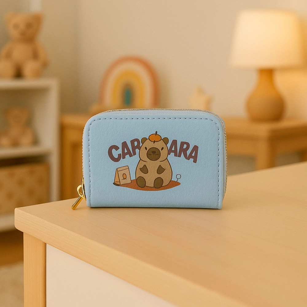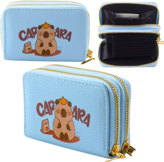 Šī gaiši zilā maka apvieno rotaļīgu kapibāras dizainu ar praktisku organizāciju. Divi zelta rāvējslēdzēji atdala glabāšanas telpu, tāpēc varat viegli nodalīt kartes, skaidru naudu, monētas un čekus. Iekšējā harmonikas konstrukcija nodrošina ātru pārskatu un ērtu piekļuvi.
