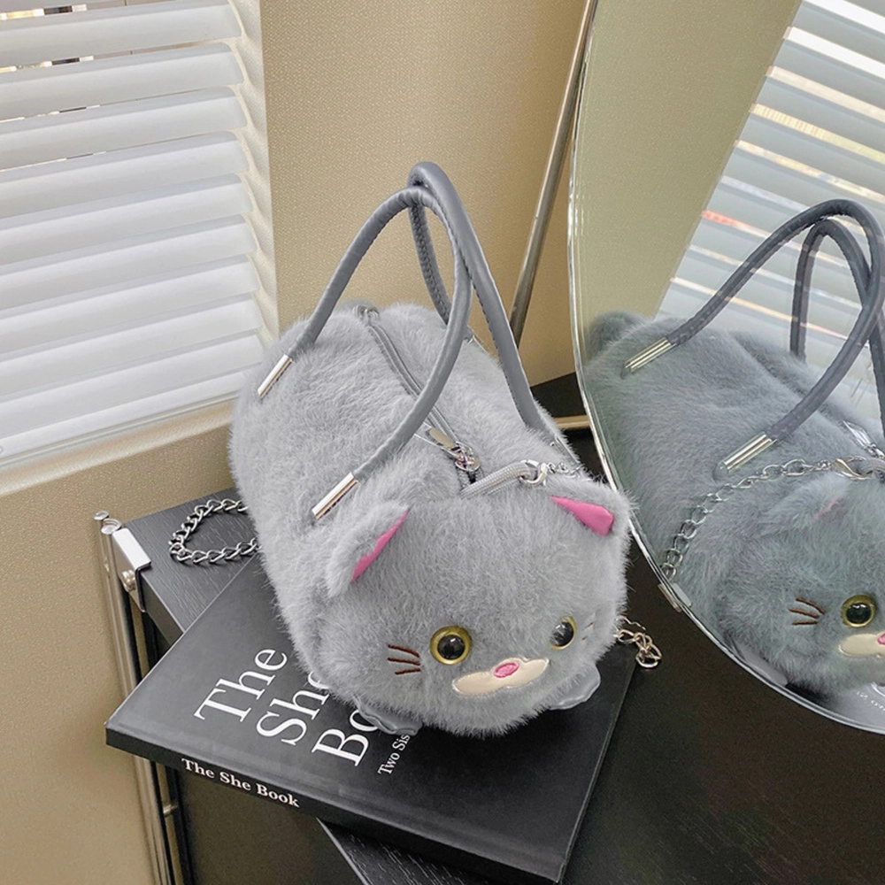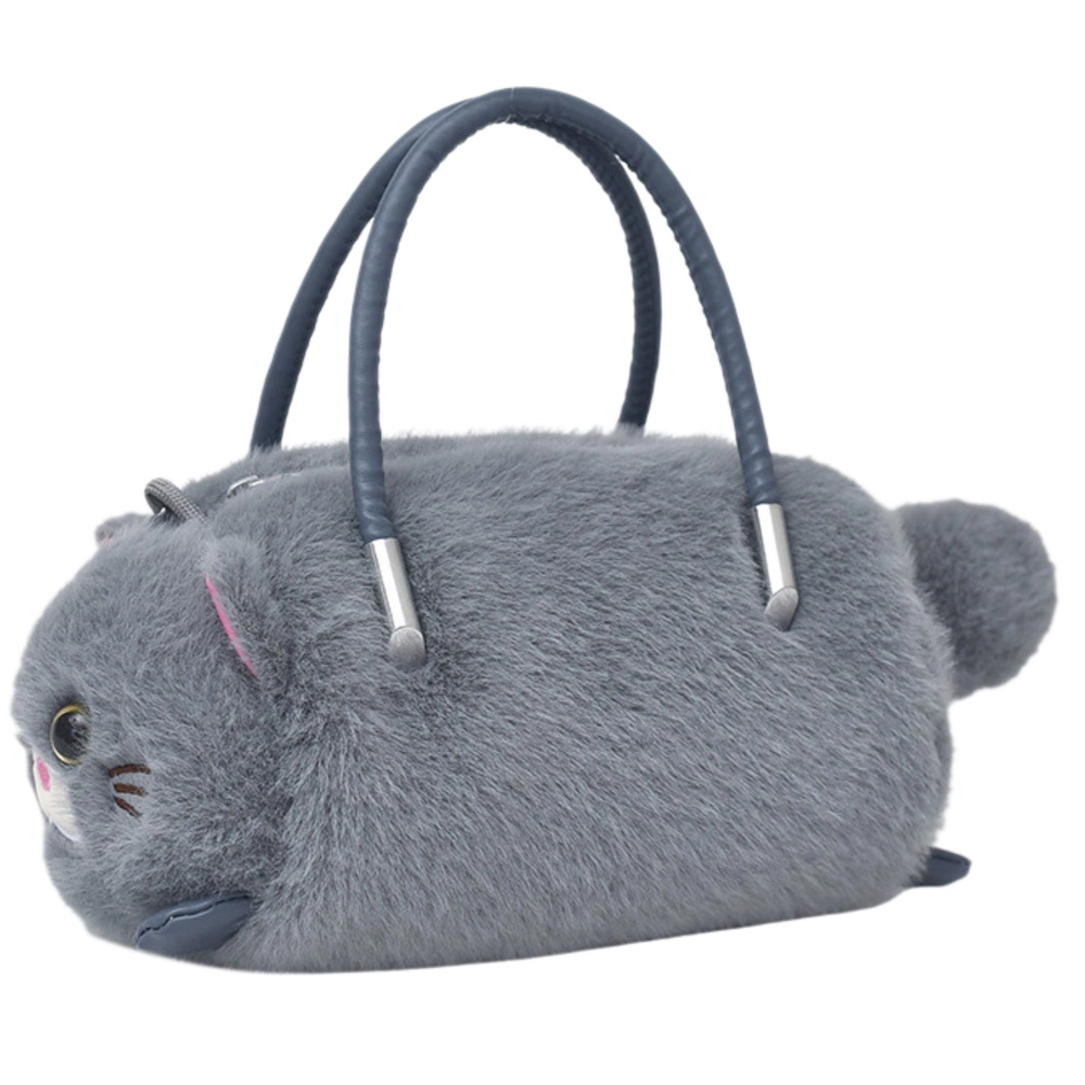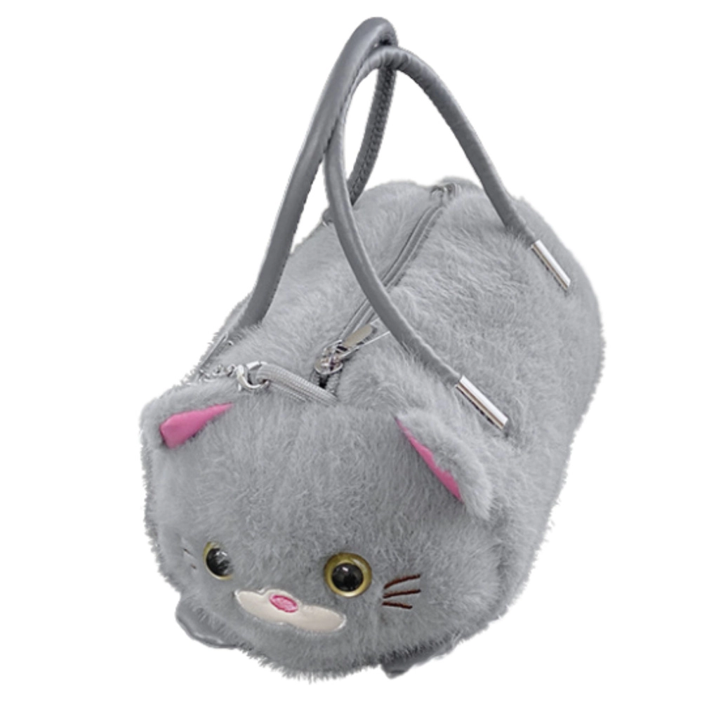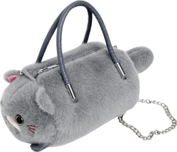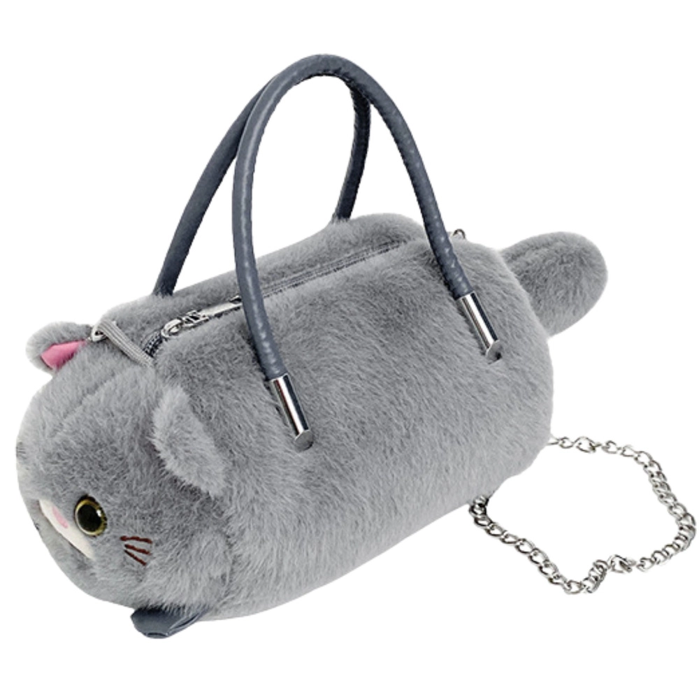Mīlīga pelēka somiņa kaķa formā apvieno mīkstu, pūkainu plīšu ar praktisku dizainu. Tai ir divi stingri rokturi, noņemama metāla ķēdīte nēsāšanai pāri plecam un droša rāvējslēdzēja aizdare. Ideāli piemērota sīkumiem bērniem, pusaudžiem un pieaugušajiem, kuri mīl oriģinālus aksesuārus.