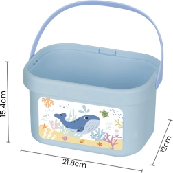 Visu var salikt izturīgā spainī ar rokturi, kura vāks kalpo kā spēles pamatne. Komplekts veicina acu–roku koordināciju, krāsu un formu atpazīšanu un radošu spēli. Lieliska izvēle jēgpilnai izklaidei mājās un ceļā.