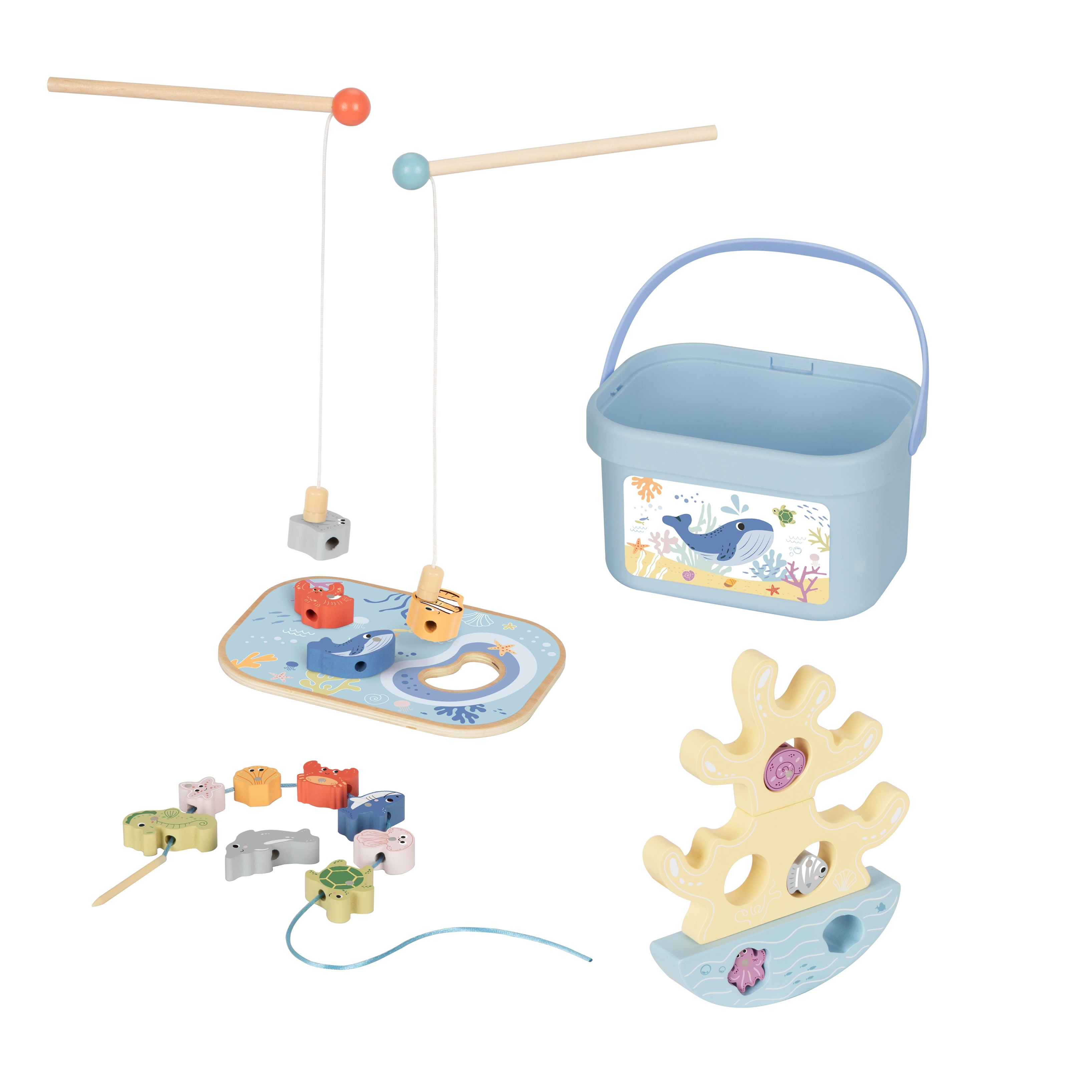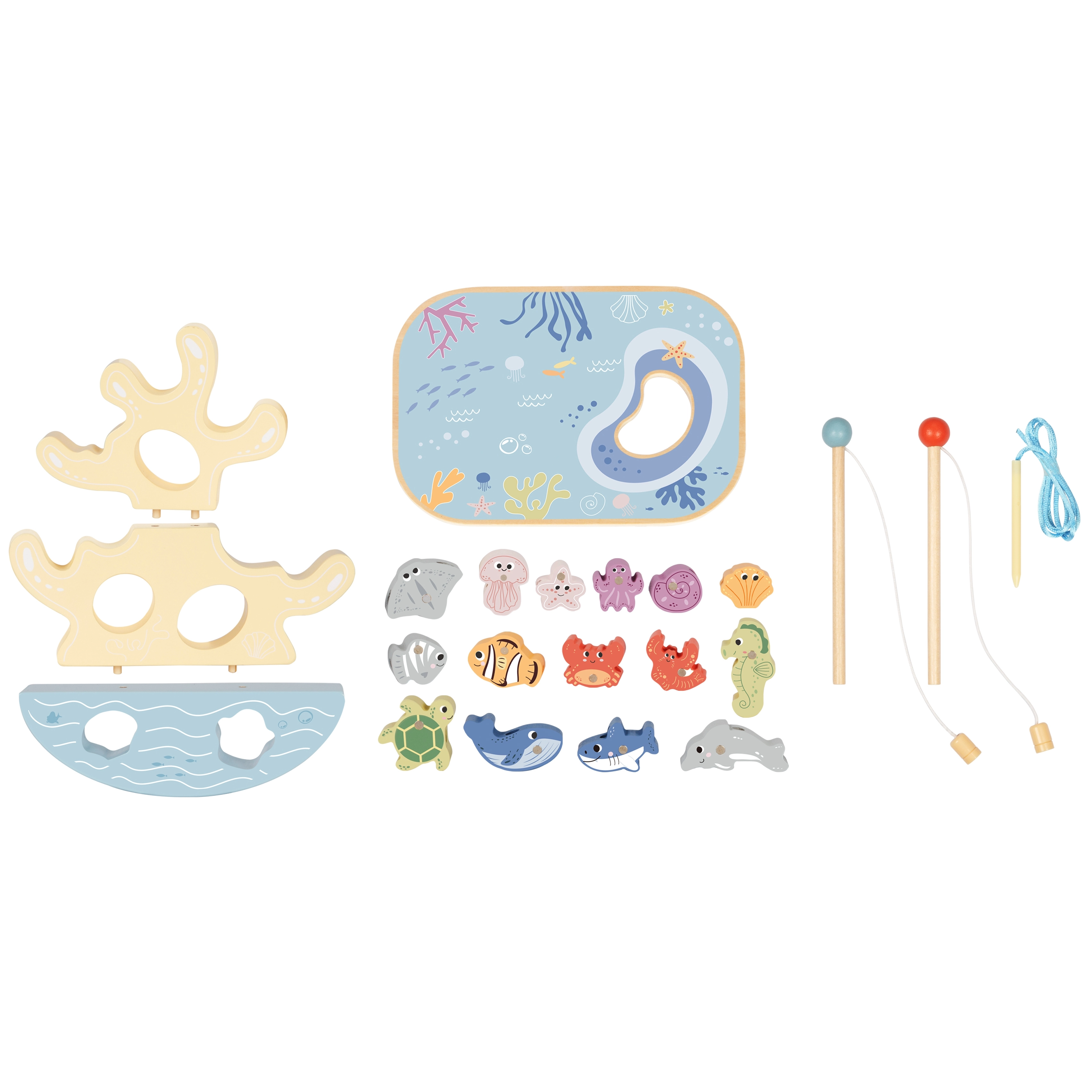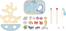 Šis radošais koka komplekts bērniem vienā iepakojumā sniedz veselu okeānu jautrības. Divi magnētiskie kāti aicina ķert košas zivtiņas, koraļļu līdzsvara tornis trenē pacietību un stabilitāti, bet vītņošanas aukla ar koka adatu attīsta smalko motoriku un koncentrēšanos. Detaļām ir patīkami noapaļotas malas un tās labi guļ bērna plaukstā.
