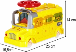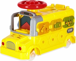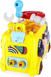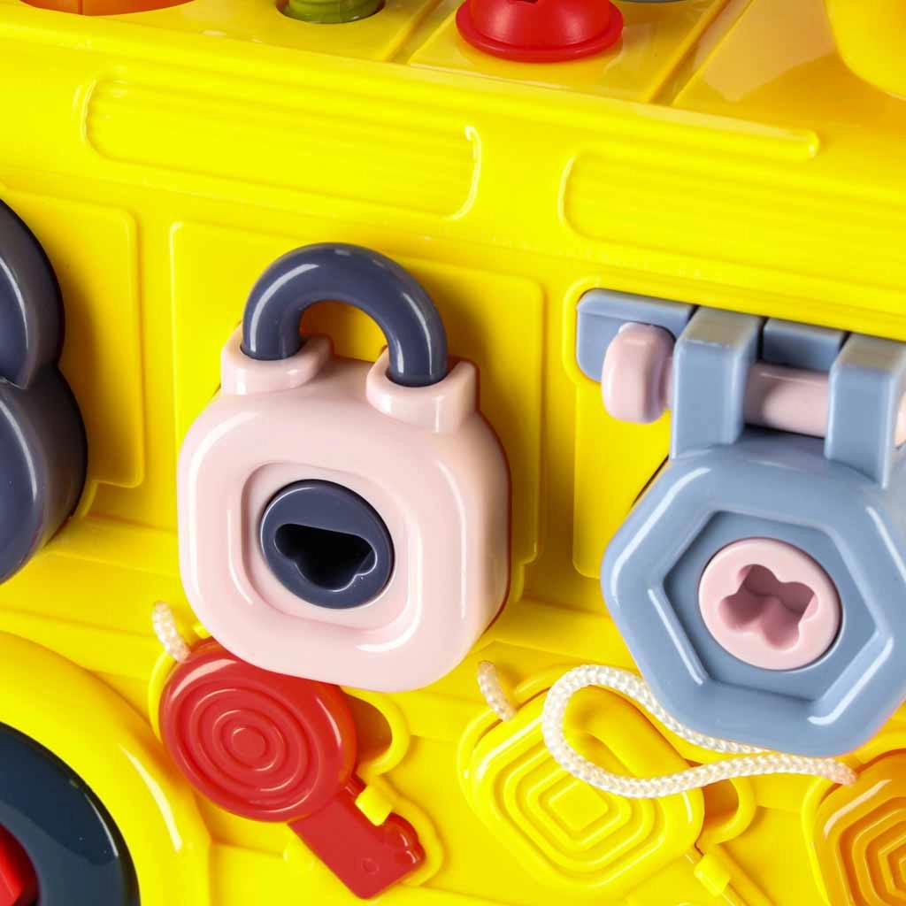 Interaktīvais autobuss apvieno transportlīdzekli un mini darbnīcu vienā. Bērni var braukt, skrūvēt, mēģināt slēdzenes ar atslēgām, grozīt stūri un izpētīt “motoru” zem atveramā pārsega. Dažādie uzdevumi dabiski attīsta sīko motoriku, pacietību un problēmu risināšanu.
