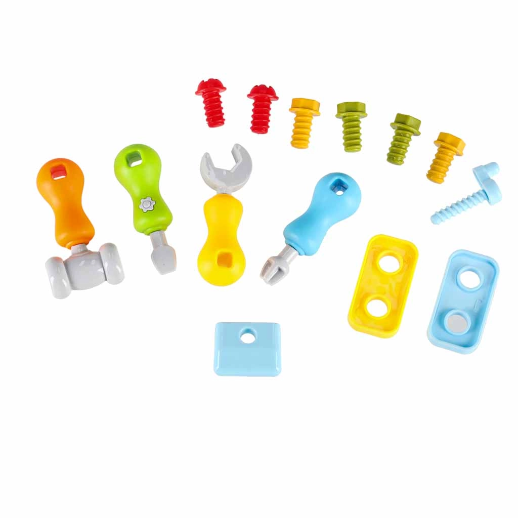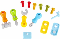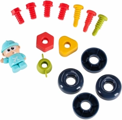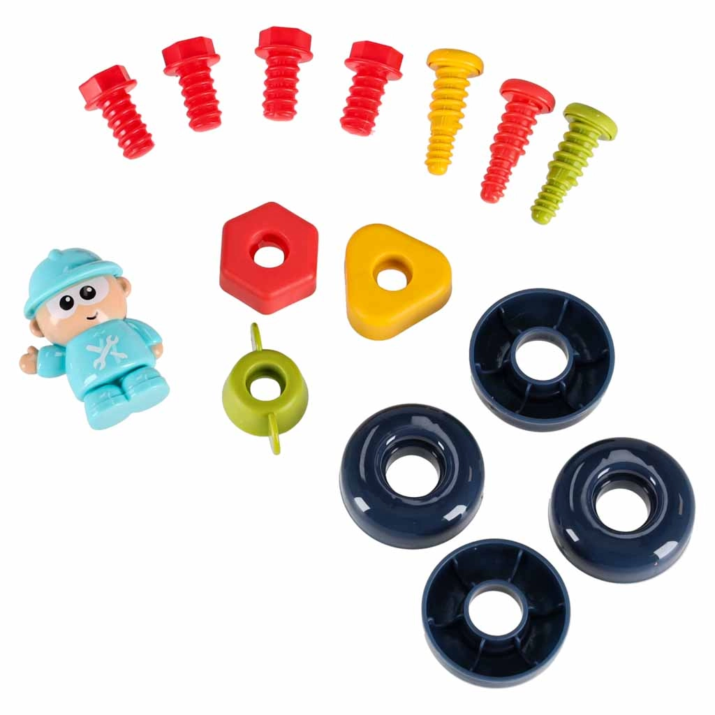 Komplektā iekļautas skrūves, uzgriežņi, zobrati, skrūvgrieži, atslēga un āmuriņš. Bērni trenē precizitāti un koordināciju, stiprinot detaļas un mācoties atpazīt formas.