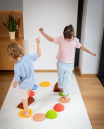 Sensorā līdzsvara taka maigās pasteļkrāsās ir piemērota bērniem un pieaugušajiem līdzsvara, stabilitātes un telpiskās uztveres attīstībai. Dažādie virsmas reljefi – no maigiem izciļņiem līdz izteiktākiem masāžas punktiem – nodrošina bagātīgu taktilo pēdu stimulāciju un veicina pareizu ķermeņa stāju.