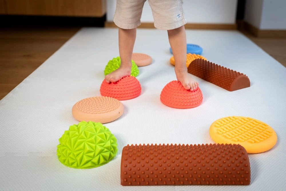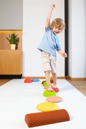 Komplektā ietilpst kupolu, disku un pusvalņu kombinācija, ko var brīvi izvietot taisnās līnijās vai rotaļu maršrutos. Pateicoties stingrajai, bet elastīgajai konstrukcijai un pretslīdes apdarei, detaļas ir drošas uz līdzenām grīdām un vingrošanas paklājiem. Piemērots mājas treniņiem, bērnudārziem, skolām, fizioterapijai un sensorajai integrācijai.