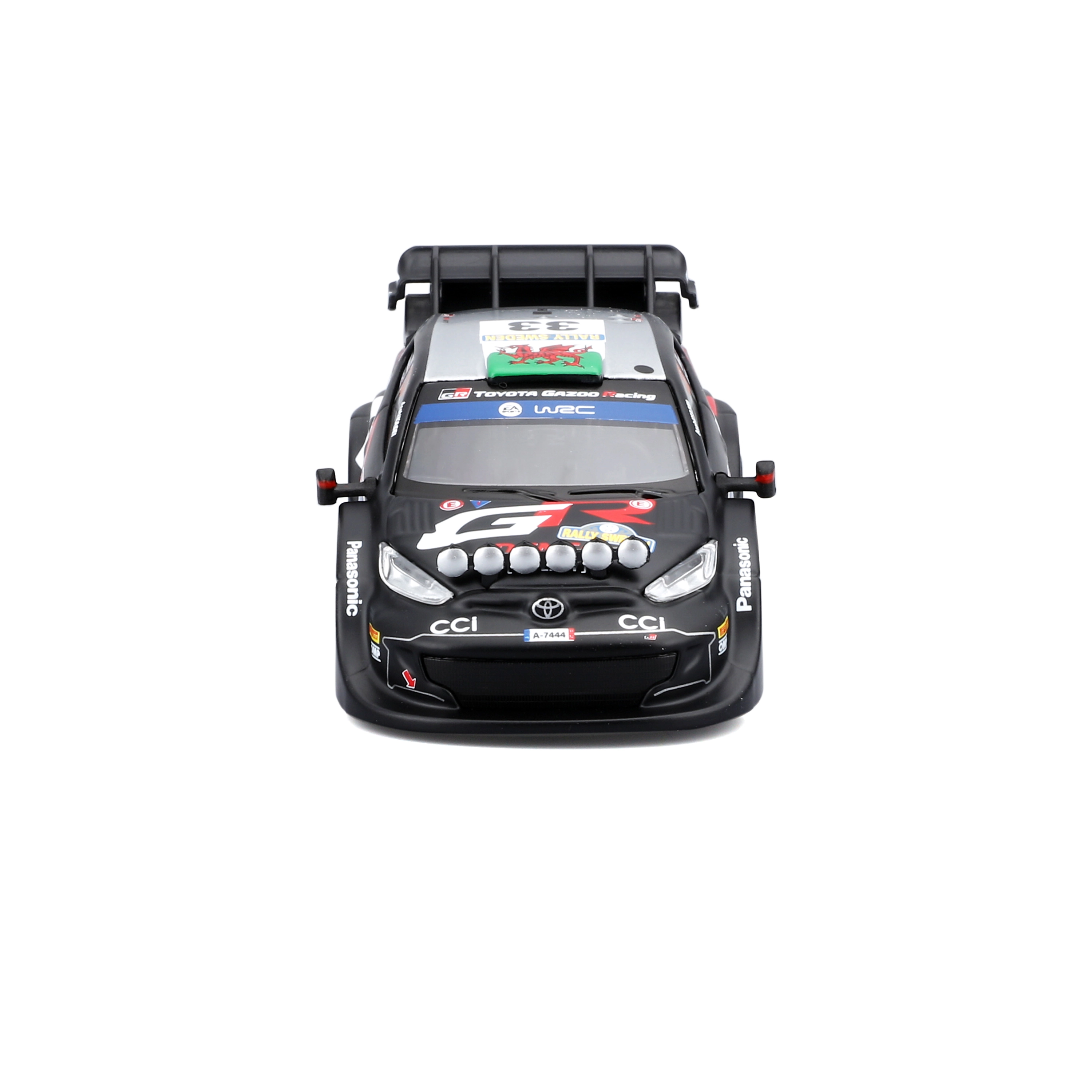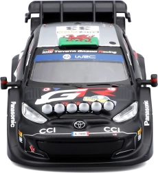 Detalizētas uzlīmes, papildlukturi un aerodinamiskie elementi precīzi atbilst īstajam Toyota GR Yaris Rally1 sacīkšu speciālam.