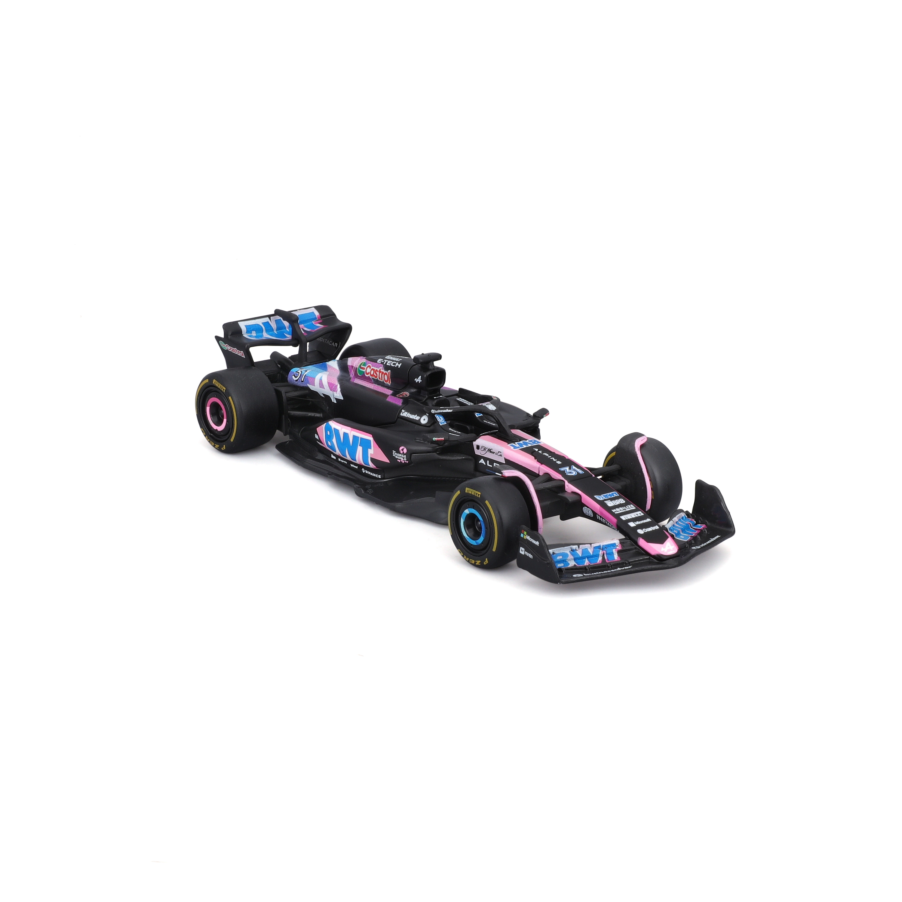 Raksturīgās BWT krāsas ar rozā un zilajiem akcentiem, precīzi logotipi un sacīkšu detaļas realistiskam izskatam vitrīnā.