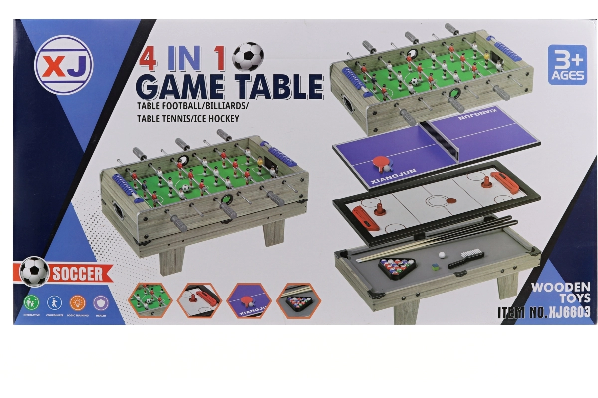 Universāls 4 vienā galda spēļu komplekts apvieno futbolu, hokeju, pingpongu un biljardu vienā izturīgā koka izpildījumā. Pateicoties robustajai pamatnei un vieglajai spēļu virsmu maiņai, bērni un pieaugušie izbaudīs stundām ilgu izklaidi. Ideāli bērnu istabai un ģimenes vakariem, piemērots no 3 gadu vecuma.