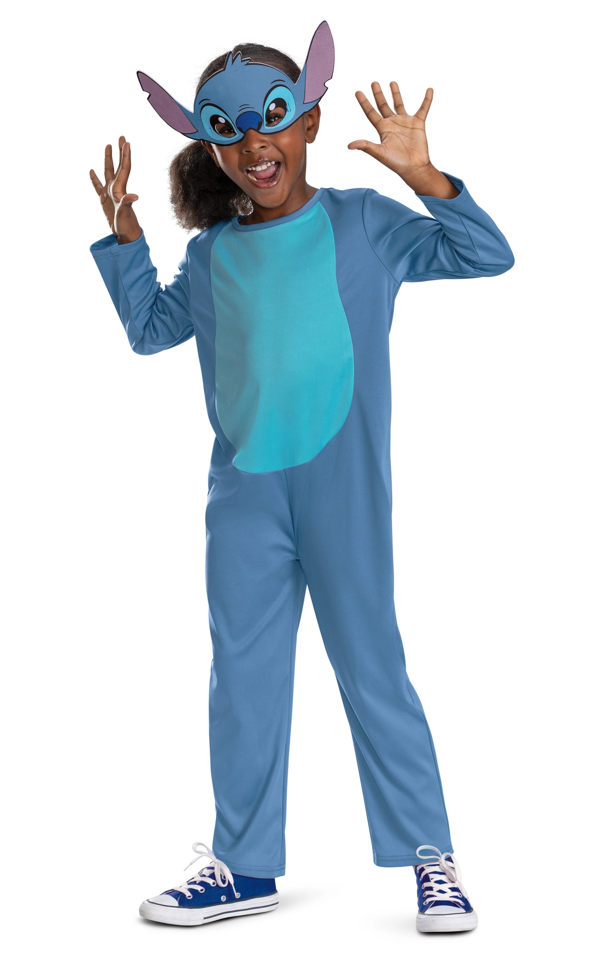 Zils kombinezons ar gaišāku vēdera paneli un raksturīgu masku uzticami atveido iemīļoto tēlu no Lilo & Stitch.
