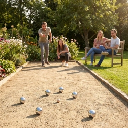 Pilns pētankas komplekts dārzam, atpūtai un kempingam. Iekļautas 8 tērauda bumbiņas (Ø 70 mm) ar rievojumu vieglai atšķiršanai, koka košons (jack), mērlente/aukla un praktisks koferītis. Ideāli piemērots ģimenes izklaidei un draudzīgām sacensībām brīvā dabā.