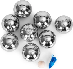 Hromēta tērauda bumbas apvieno izturību un elegantu izskatu. Trīs dažādi rievojuma raksti nodrošina ātru atšķiršanu spēles laikā. Iekļautā mēraukla palīdz precīzi noteikt, kurš ir tuvāk – godīga spēle bez strīdiem.