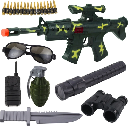 Šis pilnais militārais komplekts ir ideāls bērniem, kuri mīl darbīgas spēles un misiju sižetus. Reālistiskā plastmasas šautene zaļā maskēšanās dizainā labi ieguļ rokā un ar mehāniskā šāviena efektu piešķir spēlei intensitāti. Piederumi kā binoklis, rācija, granāts un taktiskās brilles ļauj veidot savus stāstus un attīstīt fantāziju un sīko motoriku.