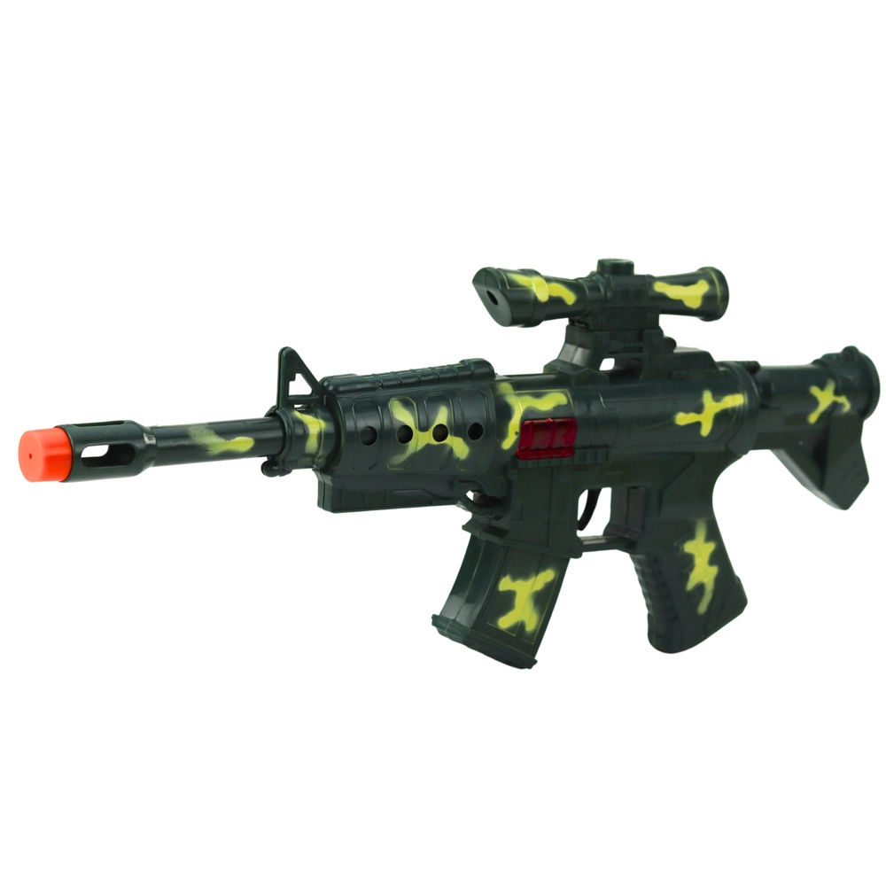 Nospiežot mēlīti, skan izteikts mehānisks šāviena efekts, kas pastiprina spēles atmosfēru. Plastmasas konstrukcija ar maskēšanās detaļām ir viegla un droša bērniem.