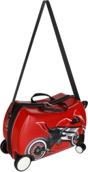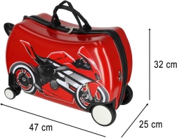 Izklaidējošs un praktisks ceļabiedrs: šis bērnu čemodāns ar motocikla motīvu apvieno bērnu braucamrīku un rokas bagāžu. Pateicoties četriem klusajiem ritenīšiem, vieglai konstrukcijai un noņemamai plecu siksnai, bērniem to ir viegli stumt, vilkt un nest. Izturīgs ABS+PC cietais korpuss pasargā mantas ceļā, bet 30 litru ietilpība nodrošina vietu visam nepieciešamajam.