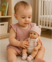 Šī mīlīgā bērniņa lelle bēšīgā bodijā ar rozā akcentiem izskatās kā īsts mazulis, pateicoties smalki veidotajiem sejas vaibstiem un proporcijām. Maigs, patīkams materiāls un kompaktais 18 cm izmērs lieliski der bērnu rociņām.