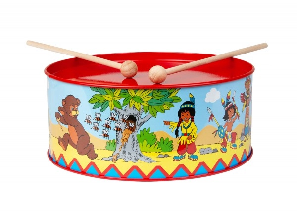 Bērnu bubins ar indiāņu rakstu, diametrs 20 cm, iepriecinās mazos muzikantus. Izgatavots no metāla, papildināts ar tekstilu un divām koka vālītēm. Komplektā ir arī aukliņa pakāršanai ap kaklu. Veicina koordinācijas attīstību, ritma izjūtu un mīlestību pret mūziku.