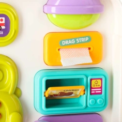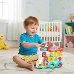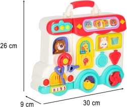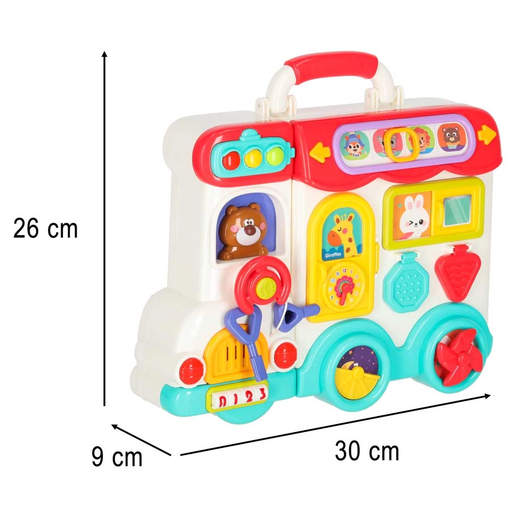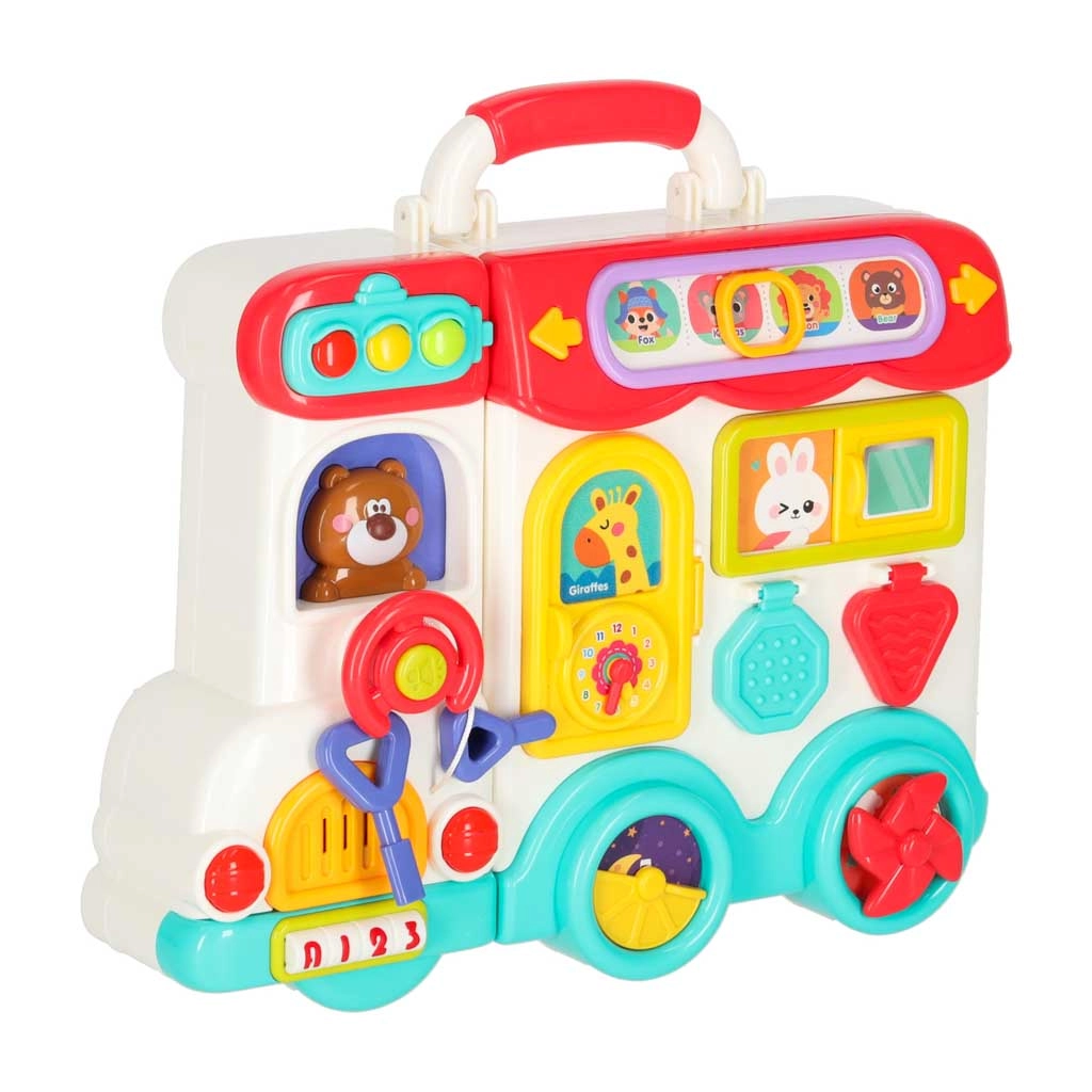Šis interaktīvais izglītojošais autobuss praktiskā koferīša formā ir mobils atklājumu centrs. Bērni griezīs stūri, spiedīs signālu ar gaismas efektu, bīdīs lodziņus, atklās ceļa zīmes, grozīs pulksteņa rādītājus un iepazīs dzīvniekus. Pagriežot uz otru pusi, tas pārtop par loģikas un sensoru paneli ar telefonu, mikroviļņu krāsni, “ledusskapi” ar gaismiņu un pareizās saskaņošanas treniņu.