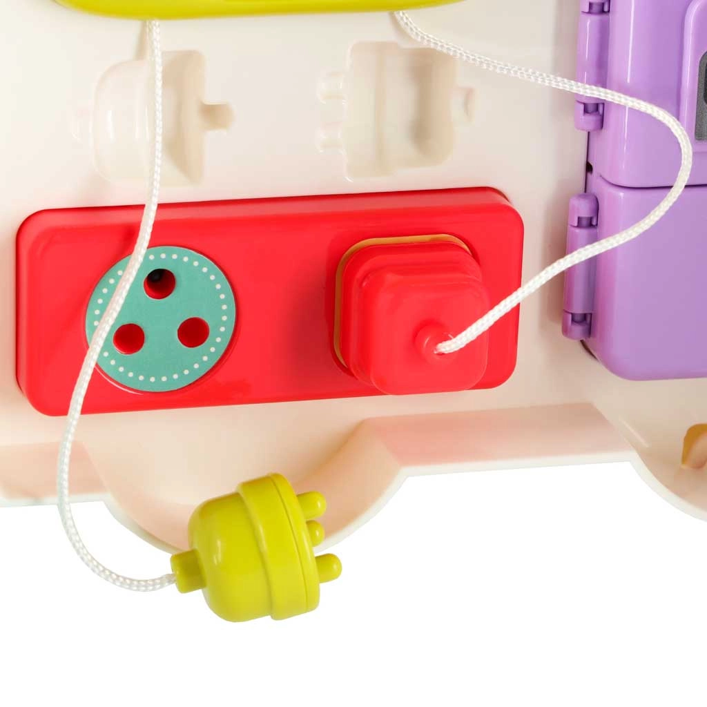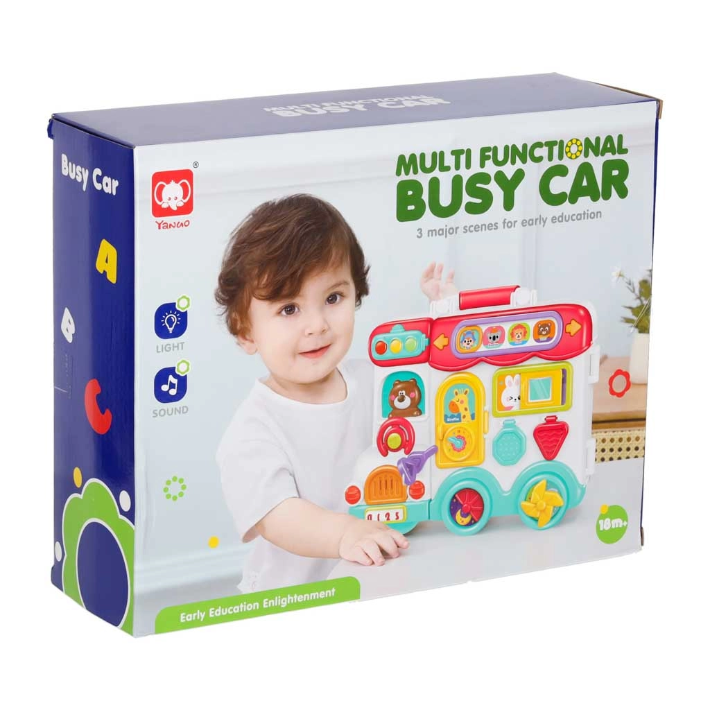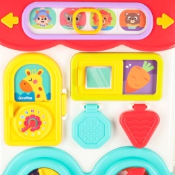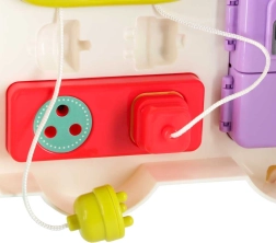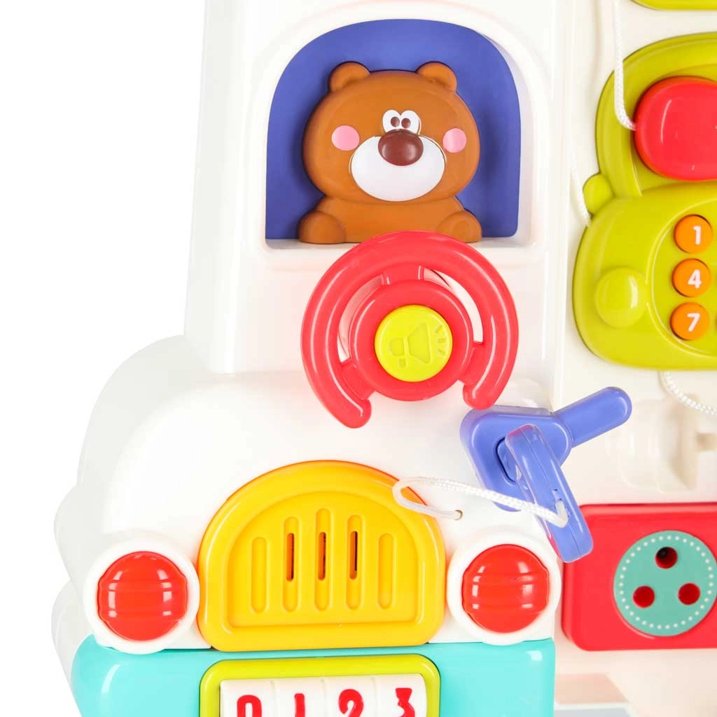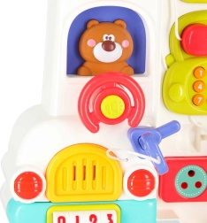 Atverams autobuss pārvēršas par interaktīvu paneli ar pogām, vāciņiem un lodziņiem. Bērns rotaļājas un vienlaikus attīsta sīko motoriku un vērīgumu.
