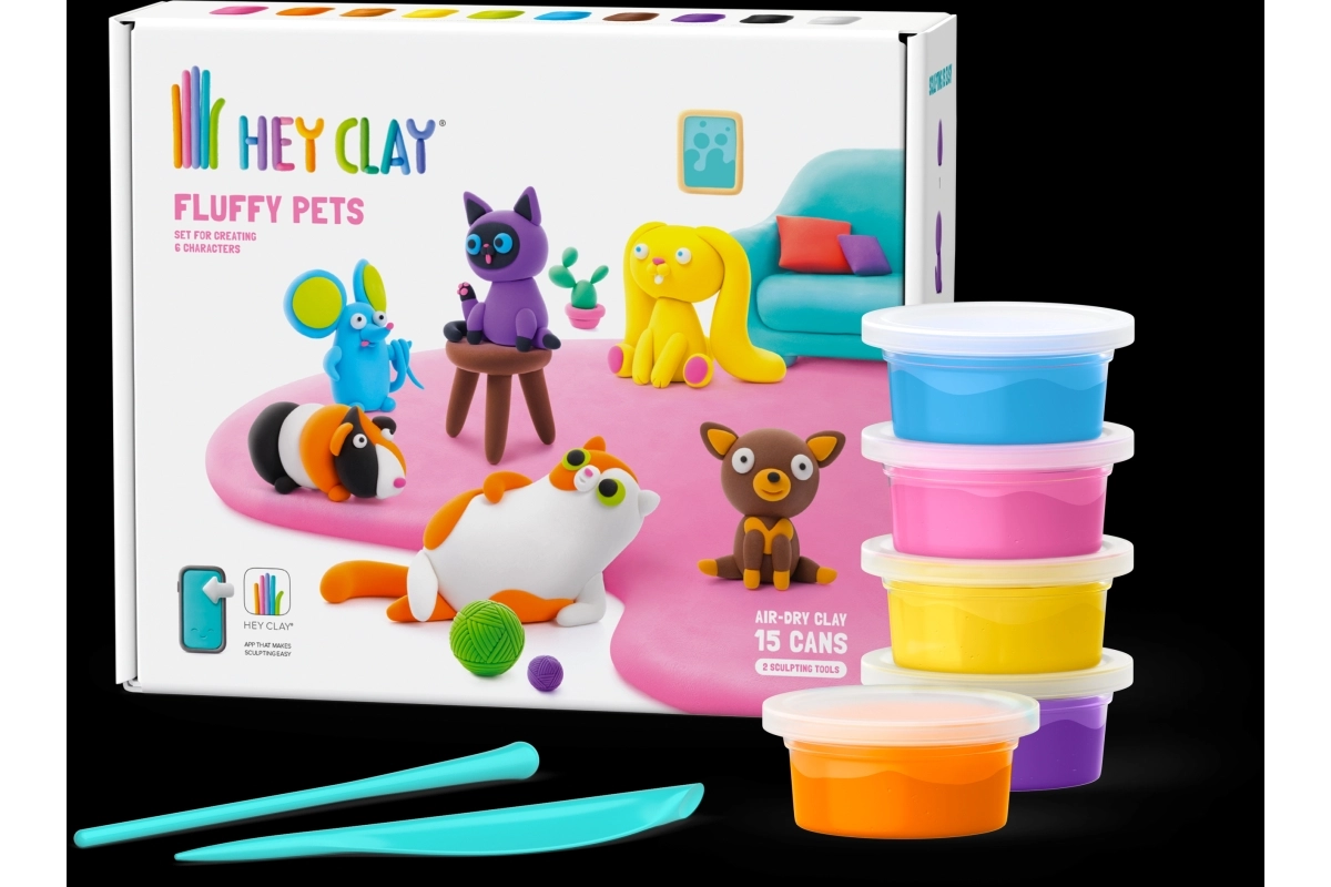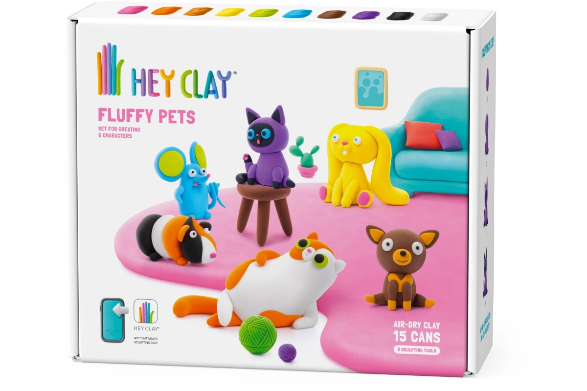 Atklājiet radošas spēles ar Hey Clay Fluffy Pets – komplektu ar 15 trauciņiem vieglas, smaržīgas un pašsacietējošas masas, ar kuru bērni soli pa solim viegli izveidos mīlīgus mājdzīvniekus. Ar bezmaksas Hey Clay lietotni (iOS/Android) un pievienoto kodu instrukciju atbloķēšanai var izgatavot 6 figūriņas: 2 sunīšus, 2 kaķīšus, jūrascūciņu un peli. Pēc izžūšanas gaisā gatavie modeļi sacietē un kļūst par daļu no turpmākām spēlēm. Vecums 3+.