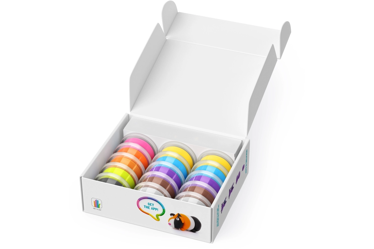 - 15 modelēšanas masas trauciņi, piekļuves kods HEY CLAY lietotnei