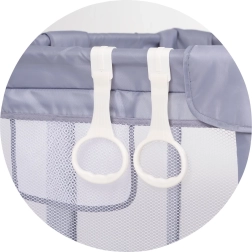 Praktiskās sānu durtiņas ar rāvējslēdzēju ļauj jūsu bērnam droši ielīst iekšā un izkļūt ārā, veicinot patstāvību un motorikas attīstību. Pastiprinātā konstrukcija ar mīkstu polsterējumu nodrošina augstāku aizsardzību un komfortu. Komplektā ir divi satveršanas gredzeni – lielisks palīglīdzeklis stāvēšanas un līdzsvara treniņiem.