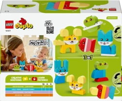 Atklājiet pirmo celtniecības komplektu pašiem mazākajiem – LEGO DUPLO Mīlīgie radošie mīluļi 3 vienā. Komplektā ar 24 lieliem klučiem bērni no 18 mēnešu vecuma var viegli uzbūvēt sunīti, kaķīti un putniņu. Tas veicina sīko motoriku, krāsu atpazīšanu un radošu spēlēšanos, pateicoties vienkāršai likšanai un draudzīgām sejiņu apdrukām.