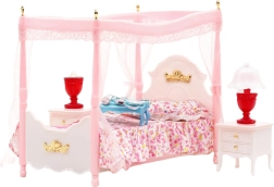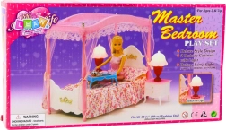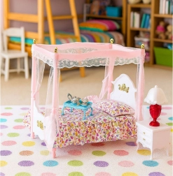 Elegants guļamistabas komplekts lellēm aptuveni 29 cm augstumā apbur ar gultu ar baldahīnu, smalkām aizkariņām un izsmalcinātu apdari. Komplektā ietilpst divi naktsgaldiņi, lampiņas un pilns gultas veļas komplekts. Pasteļtoņu rozā–baltais salikums un kvalitatīvs materiāls nodrošina izturību un ilgstošu izklaidi, attīstot radošumu un iztēli.