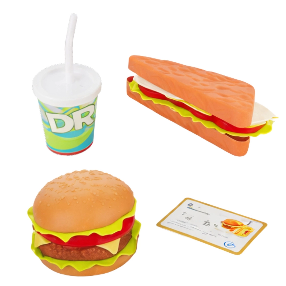 - Bagātīgs piederumu komplekts – burgers, bagete, dzēriens un citi aksesuāri pārdevēja vai pircēja lomai.