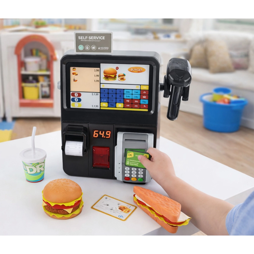 Šī bērnu pašapkalpošanās kase ir ideāla mazajiem pārdevējiem un pavāriem. Reālistiskas funkcijas – no skenēšanas un čeku drukāšanas līdz karšu maksājumiem – rada autentisku veikala vai ātrās ēdināšanas atmosfēru. Pateicoties gaismas un skaņas efektiem, spēle ir dinamiska un aizraujoša.