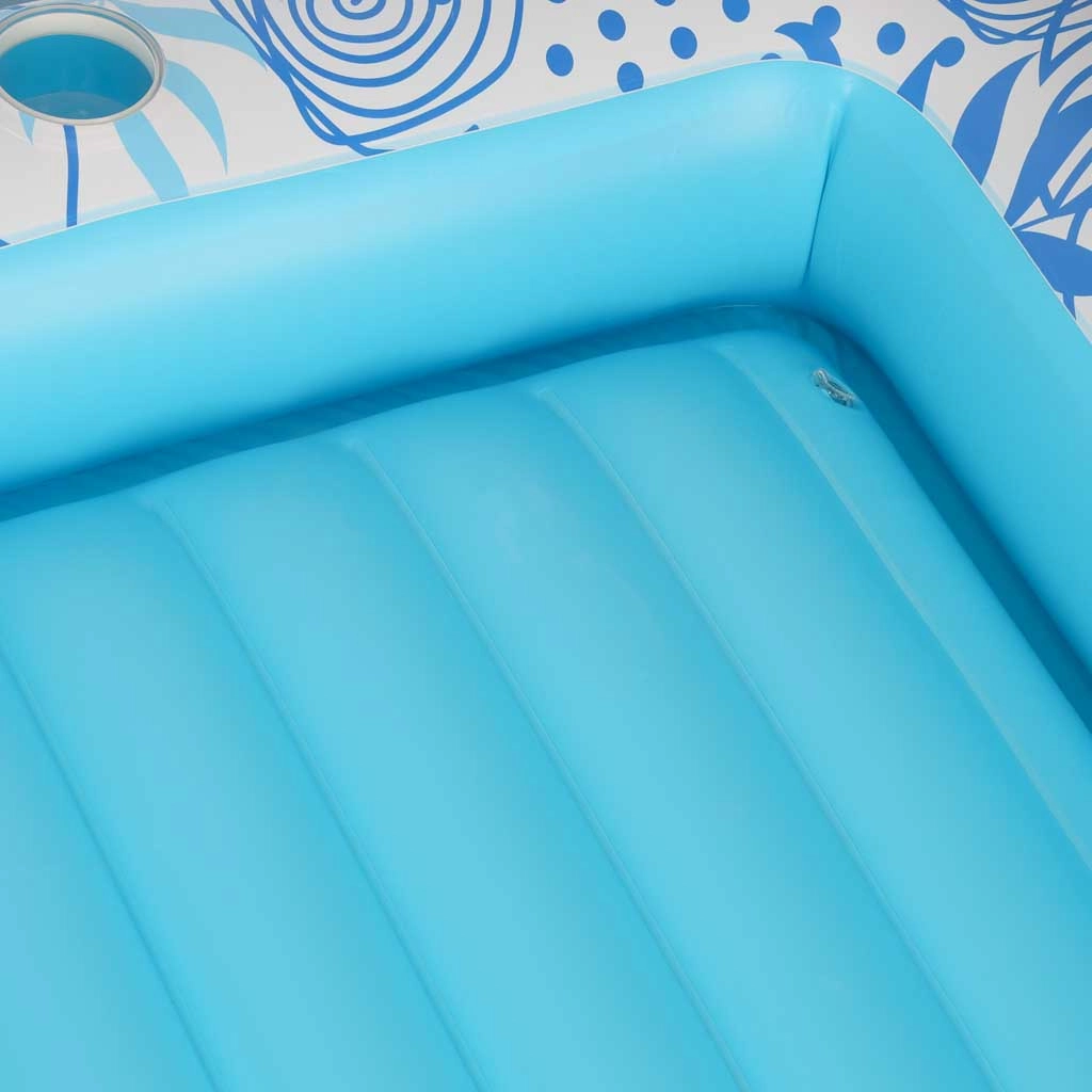 Pārdomātas detaļas, piemēram, 2 integrēti dzērienu turētāji un perimetrāla virve ērtai pievilkšanai pie krasta, palielina drošību un komfortu uz ūdens. Kvalitatīvs 0,25 mm biezs PVC nodrošina izturību vasaras lietošanā, bet maigi rievotā guļamā daļa sniedz patīkamu atbalstu.