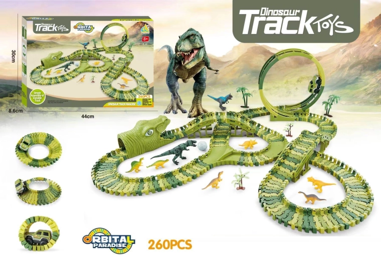 Šī krāsainā dinozauru autodrāma nodrošinās bērniem stundām ilgu izklaidi un iztēles attīstību. Pateicoties 260 detaļām, trasi var salikt dažādās formās un augstumos, tāpēc katra spēle būs citāda. Komplektā ir ar baterijām darbināma mašīnīte, kas brauc pa trasi un rosina bērnus radošai spēlei.
