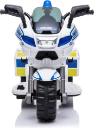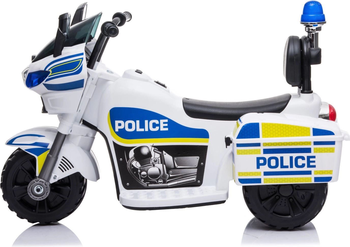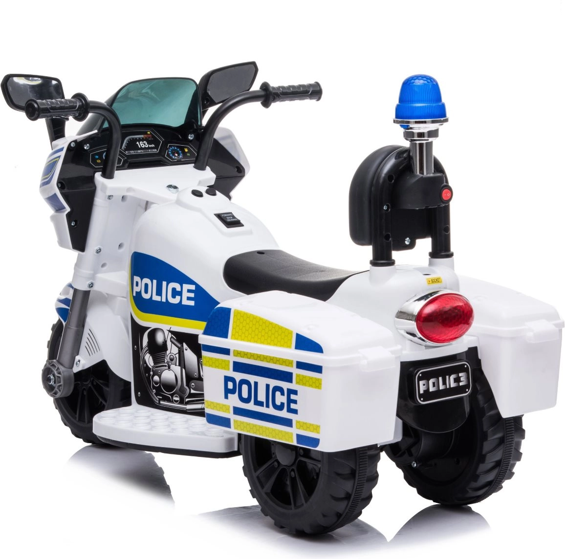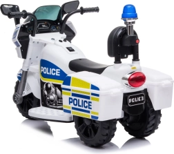 Stilīgs bērnu elektriskais policijas motocikls baltzilā krāsojumā piedāvā reālistisku policijas darbību ar mirgojošām gaismām, sirēnas skaņu un vienkāršu vadību uz priekšu/atpakaļ. Stabilā trīsriteņu konstrukcija, ergonomisks sēdeklis ar atzveltni un ātrums līdz 3 km/h nodrošina drošu izklaidi gan mājās, gan ārā. Iebūvēts MP3 ieeja, skaņas signāls un mūzikas pogas veicina lomu spēles un koordinācijas attīstību.