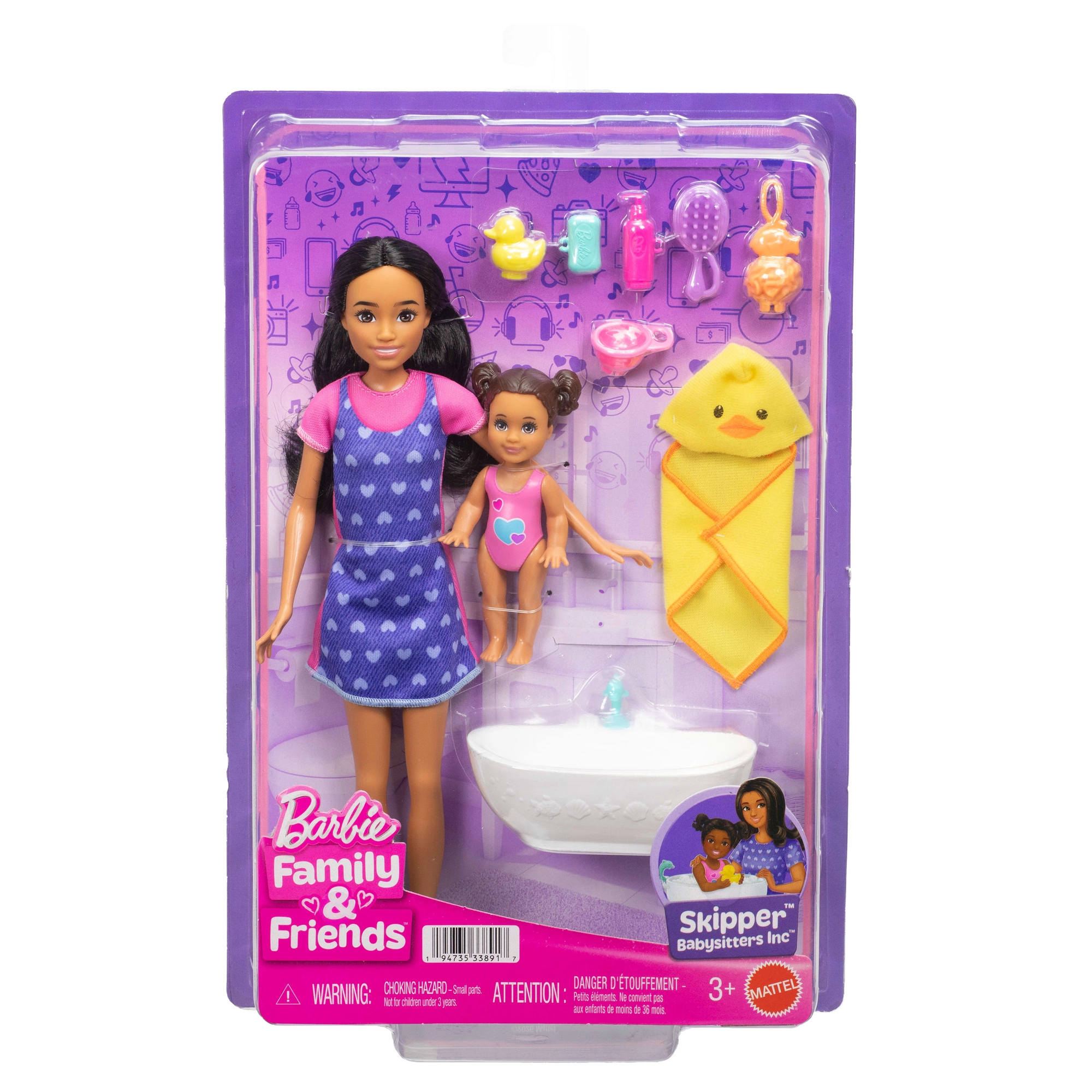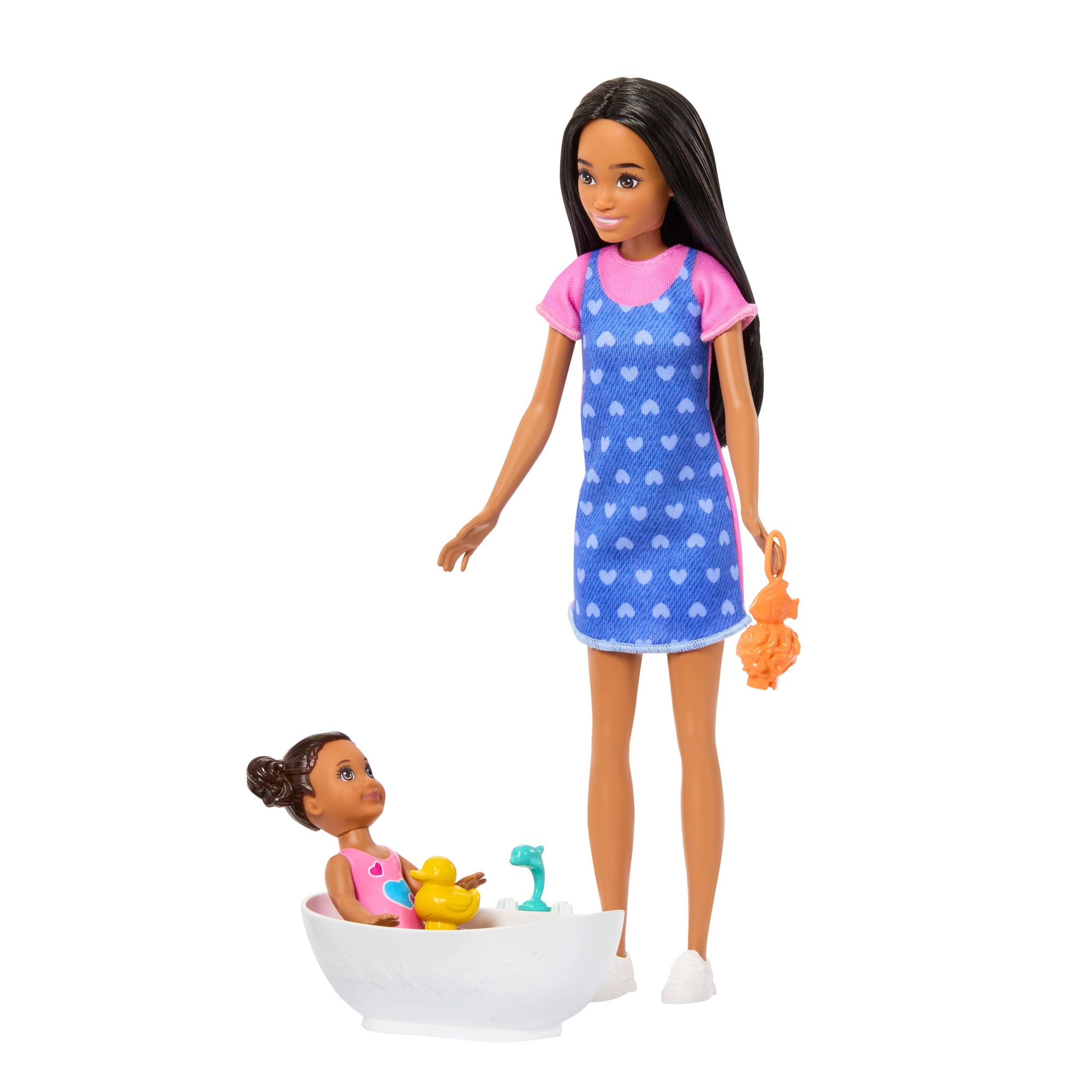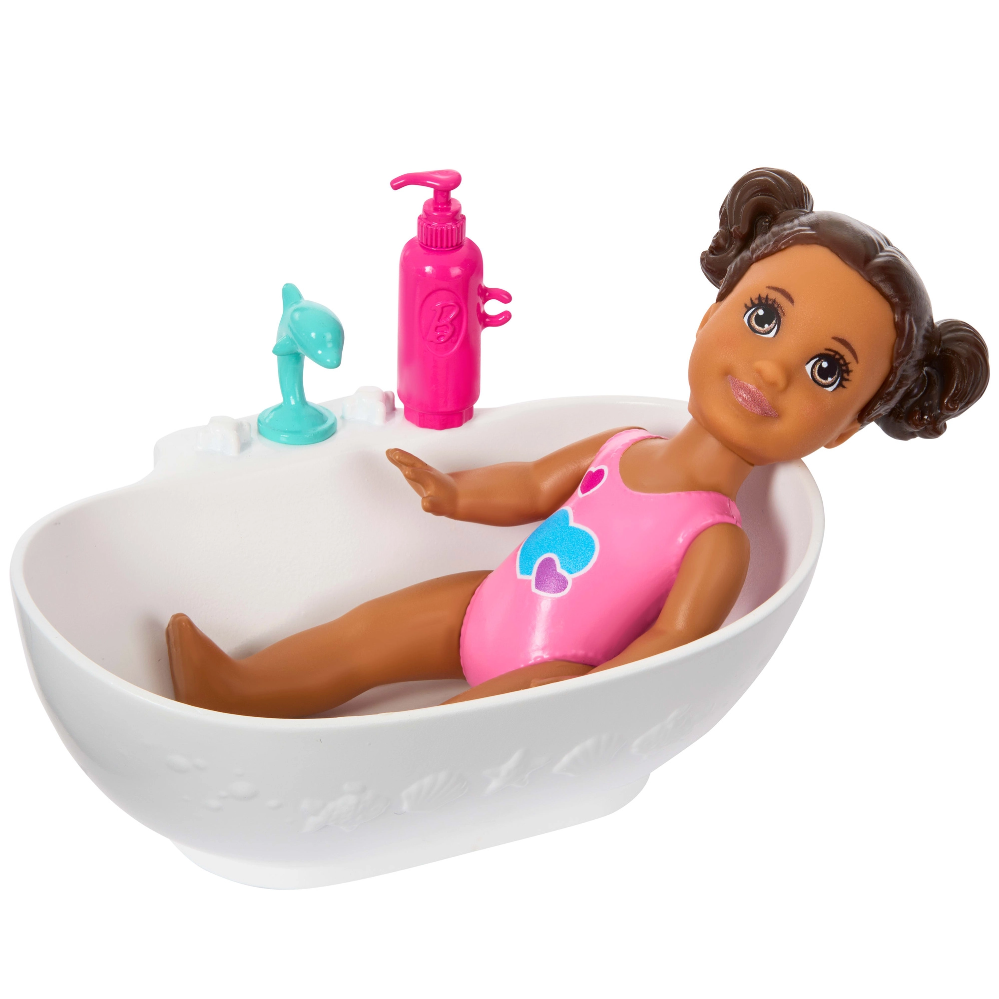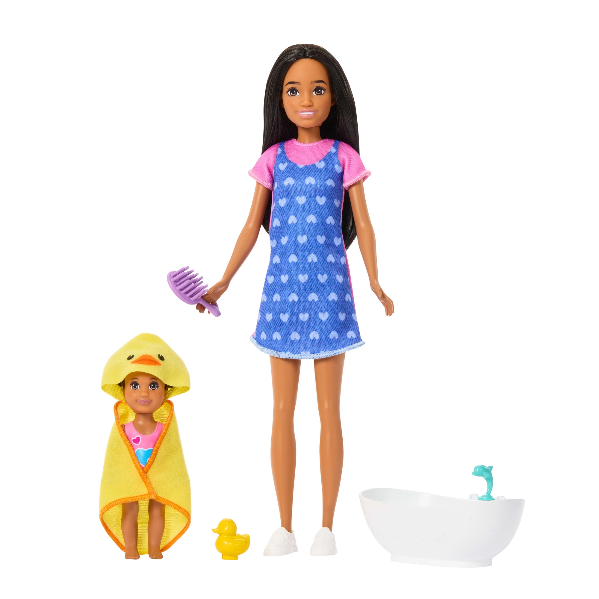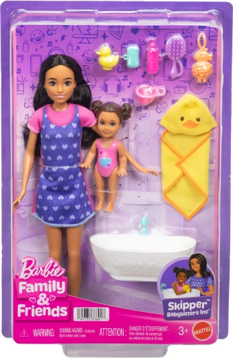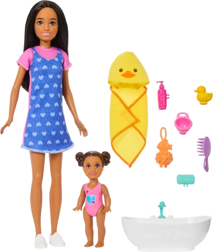 Komplekts BARBIE Skipper Mazulīša vannošana sniedz autentisku rūpju spēli par pašiem mazākajiem. Vecākā māsa Skipper ir ģērbta kleitā ar zilu priekšautiņu ar sirsniņām un ērtos kedās, bet mazulītis bauda vannu vanniņā ar mīlīgiem piederumiem. Bērni var atkal un atkal veidot vannošanās rituālus ar pīlīti, kapučveida dvieli un “kosmētiku”.